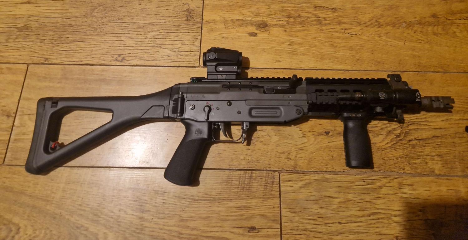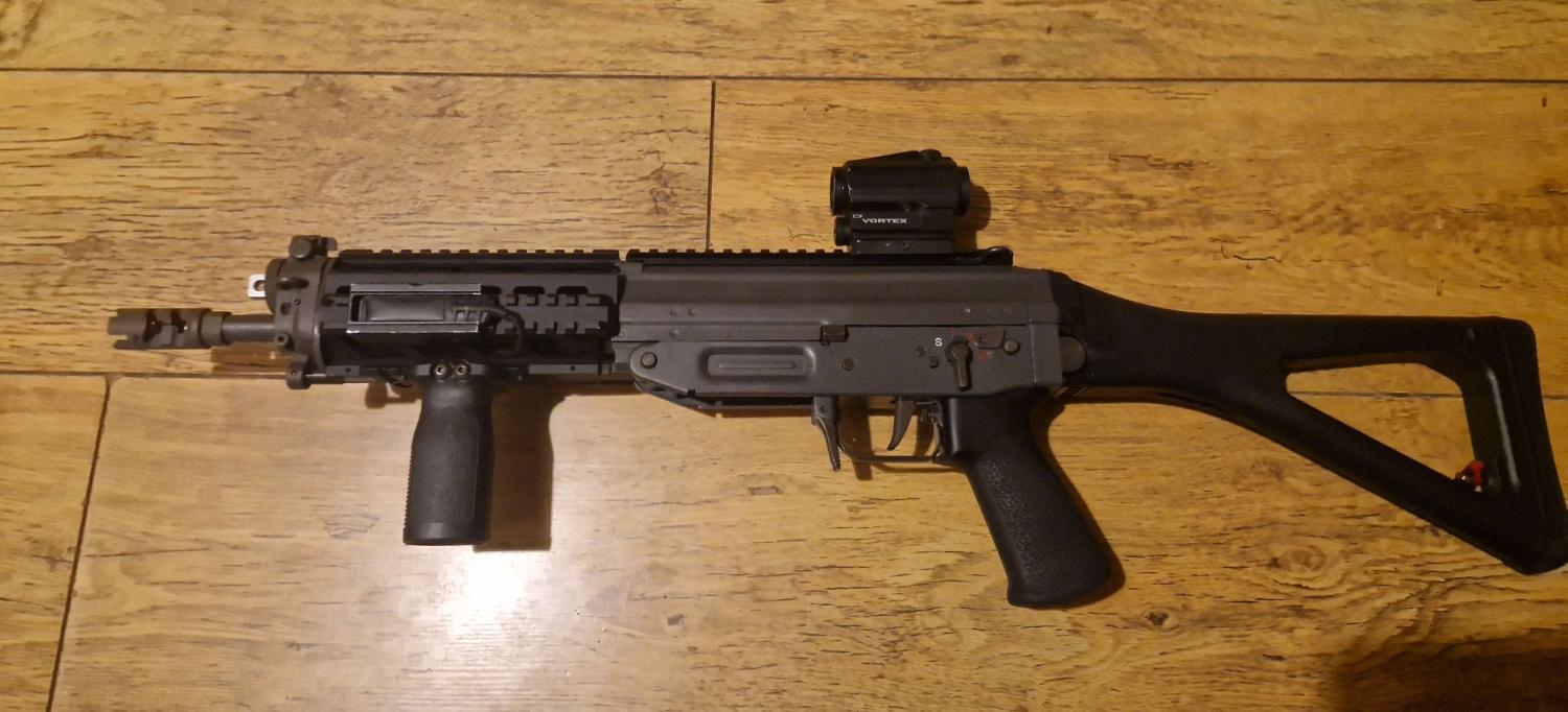 Comes with 6 leak free mags, the folding stock and quad handguard pictured. Also upgraded internally with a maple leaf barrel and rubber. The mags themselves have tape wrapped baseplates as it's one of the points of failure with these mags (along with the couplers), and in this case one or two of them have split. Other than this, the gun is one of the most realistic I have owned, the finish is exceptional and it manages to go through around 3 mags of BBS on one fill, even in the colder months. I have always been astonished by how efficient it is. Unless mentioned this comes with no further attachments, it will also come with the stock SIG pistol grip, but the Hogue can be thrown in for the right offer.