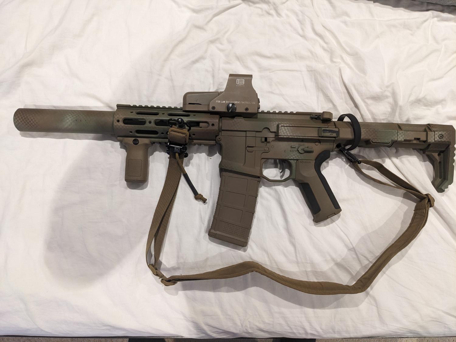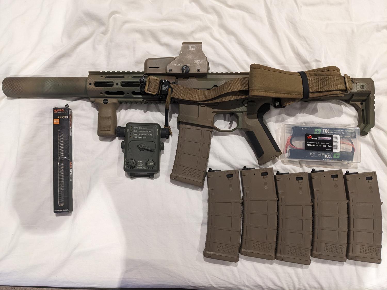 Externally I have given it a custom spray job, it has a two point sling with a ranger band for storage, a holo sight (552 I think?), Airtech Studios Barrel Stabiliser and battery extension, an Ares pro pistol grip, a PTS foregrip, a PTS Radian Raptor charging handle and an Airsoft artisan honey badger stock. This gun was my first and is an absolute workhorse, If you have any questions feel free to pm me!