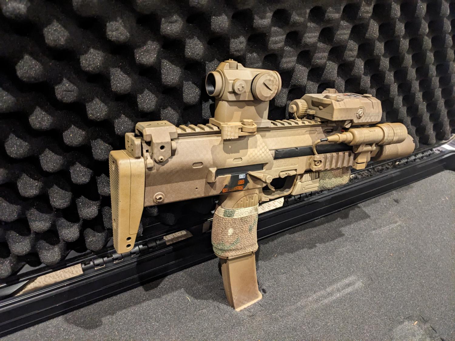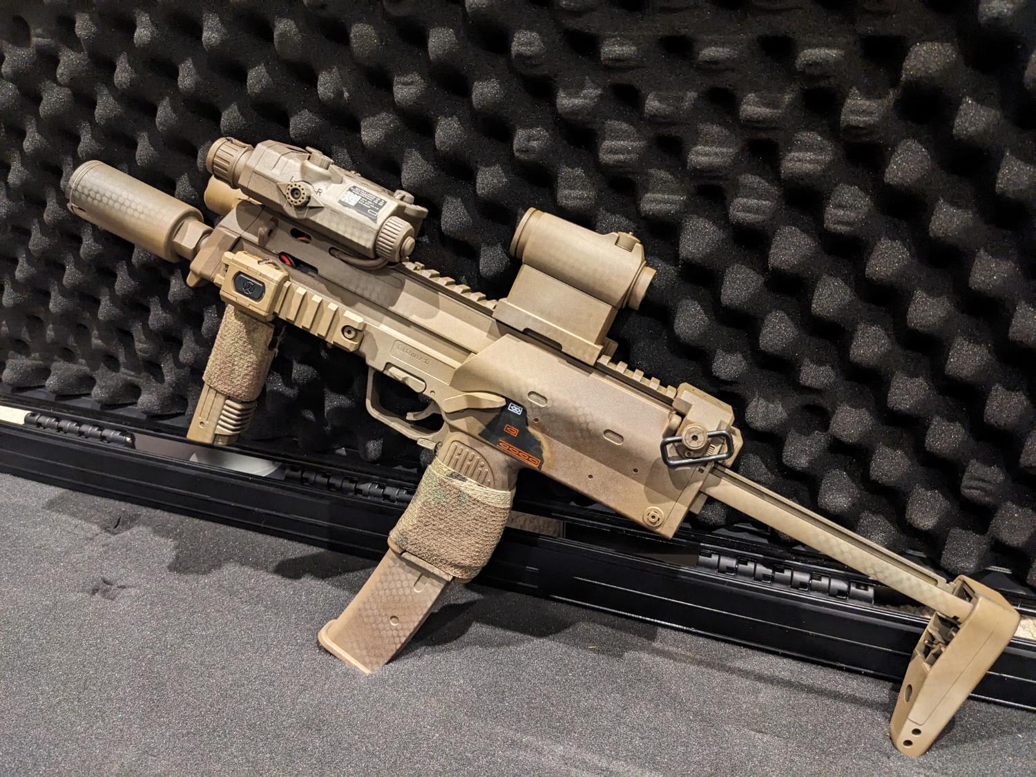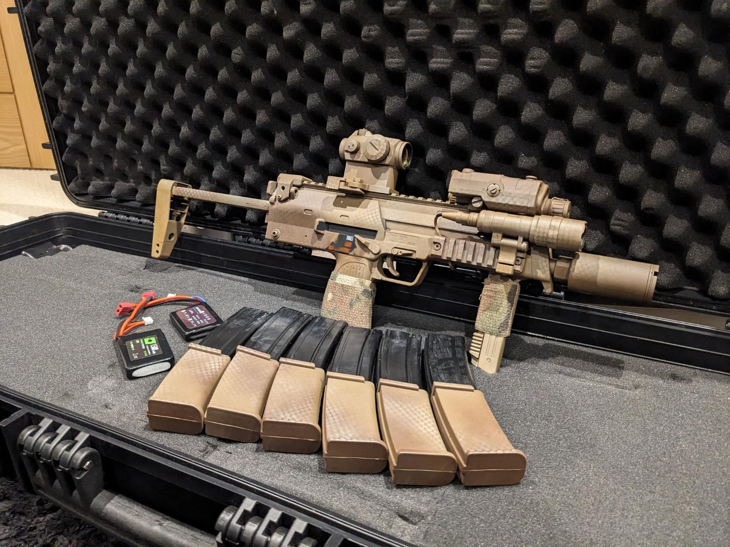 This is my beloved mp7, it has been sprayed and upgraded by Kingdom of Airsoft, it has a few bits and bobs added to make it an absolute pleasure to use. This is a package so comes with everything seen on it and in the pictures (apart from the case XD). Package includes: RIF, 6 magazines (100rd mags), two 11.1V batteries, a dummy peq box for battery, WoSport sound hog, laylax sling mount, torch and modlite button; and an aimpoint T2 repro. Internally this has been fully upgraded, I will list below the bits done to it by Kingdom of Airsoft (KoA):