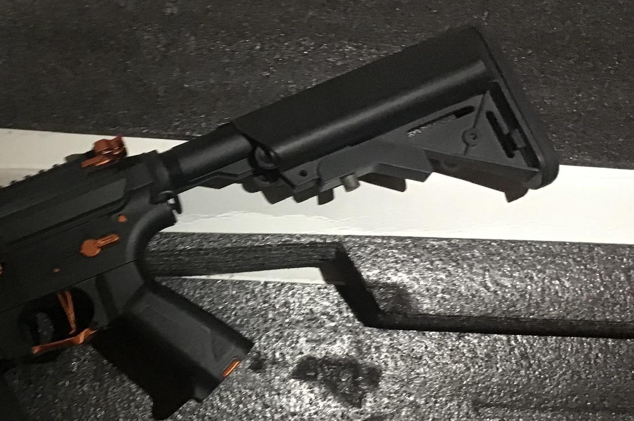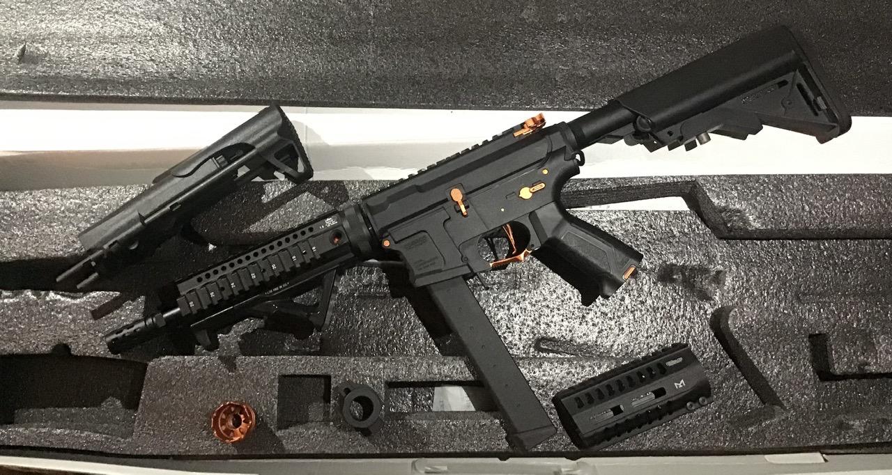 in addition to the orange coloured anodised alloy metallic parts, at the charging handle, bolt release, fire selector, charging handle, bolt cover, outer barrel, trigger guard, this has an M4 style stock tube, barrel extension and extended front ris handguard