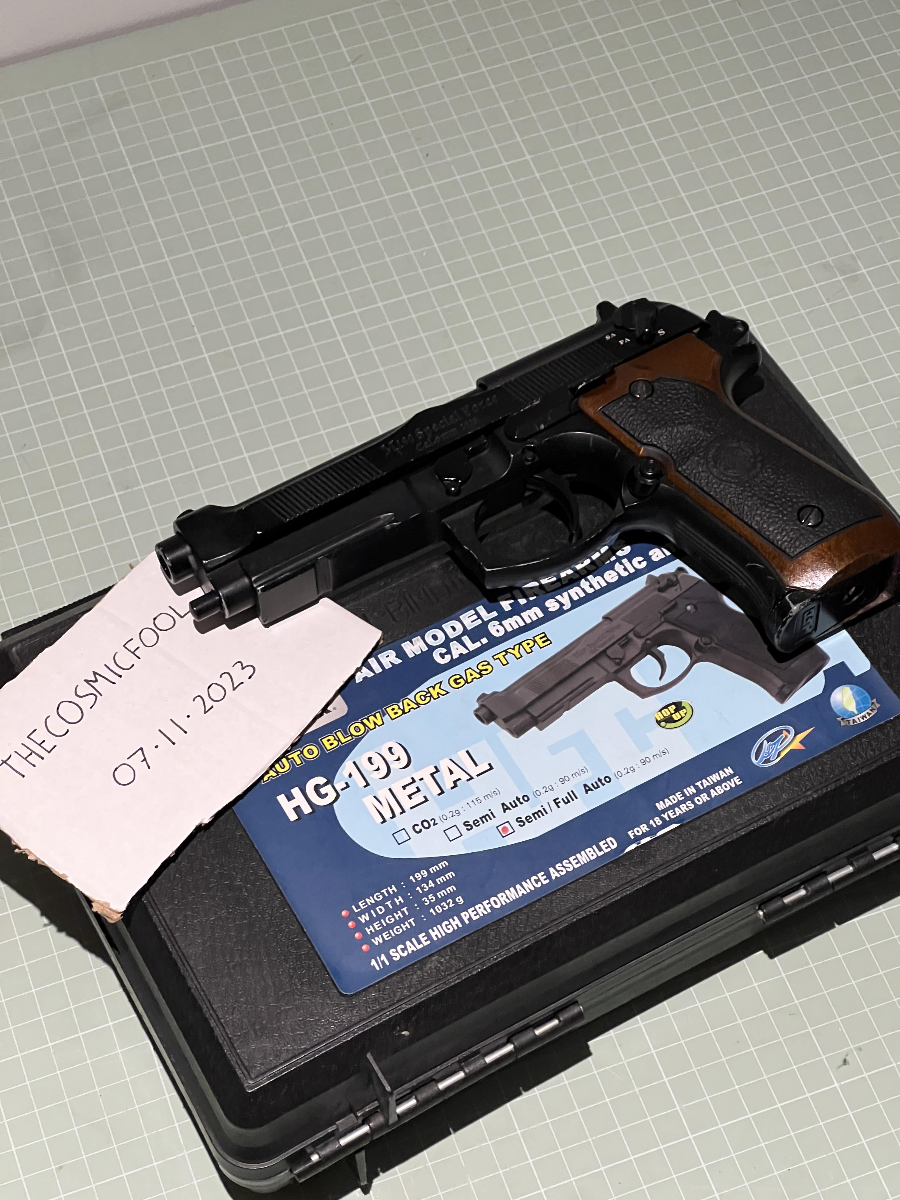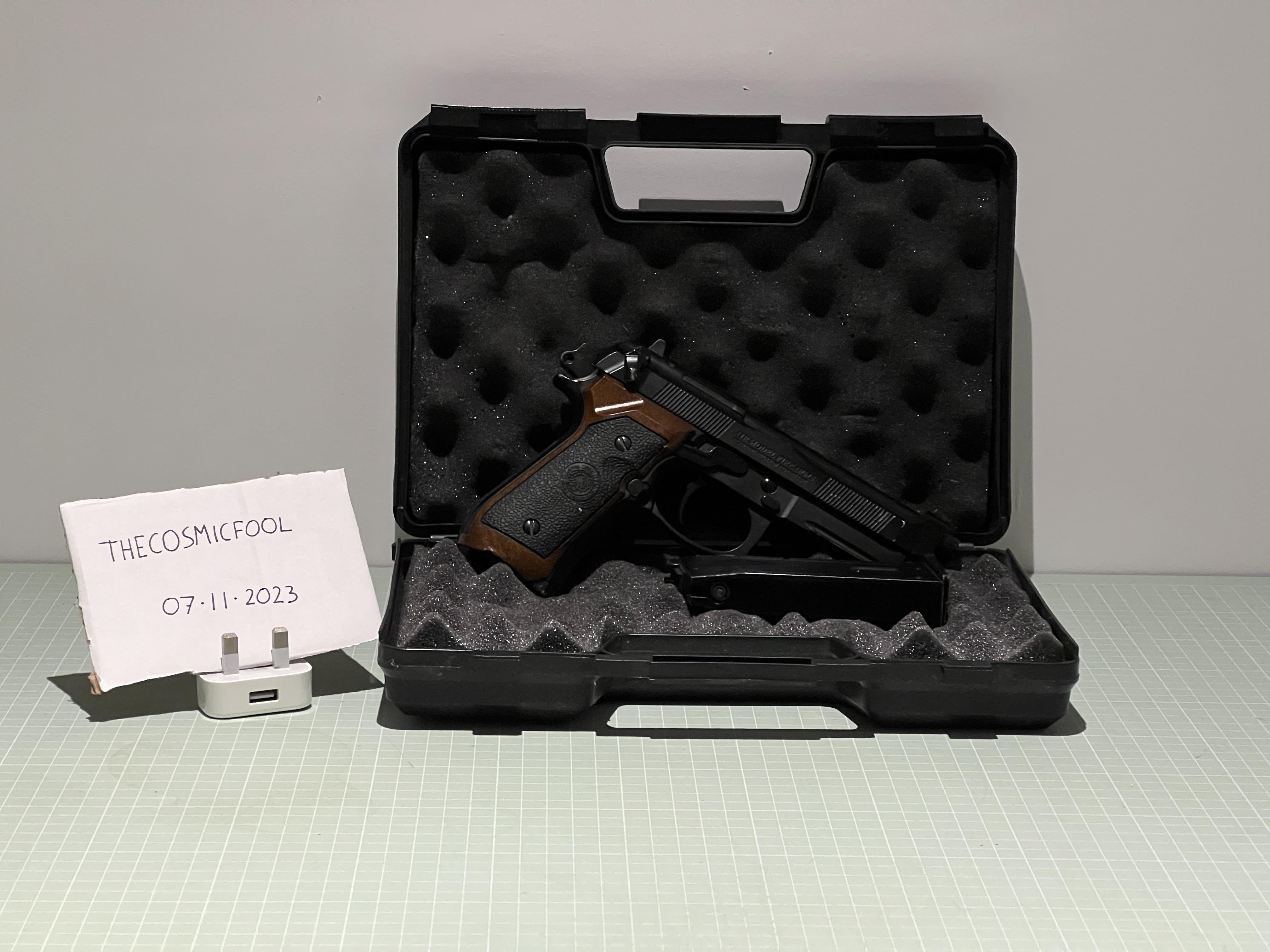 Lux Air (?) fully metal M9 replica that bizarely fires in full auto. A lot of fun when operational. Case an 2x mags included.