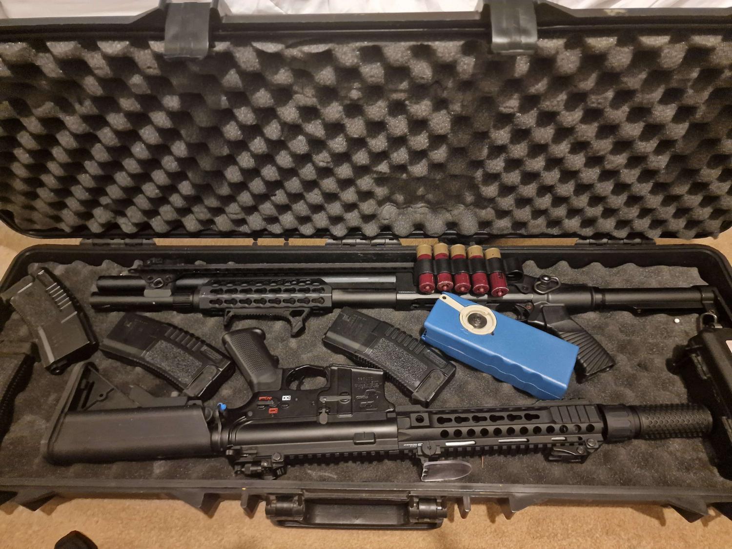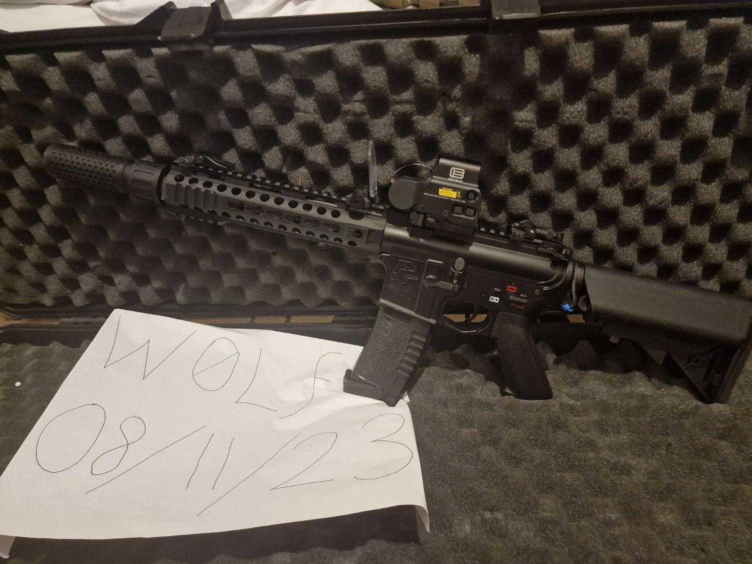 – G&G Armament GC16 MPW 9″ AEG – Used 6/7 times? also most were half days as switching with the shotgun, minimal sratches, only on the suppresor and udnerbarrel which i done when taking the photos as i tried to reattach the underbarrel grip but forgot how which led to me scratching it (Can easily hide with a grip)