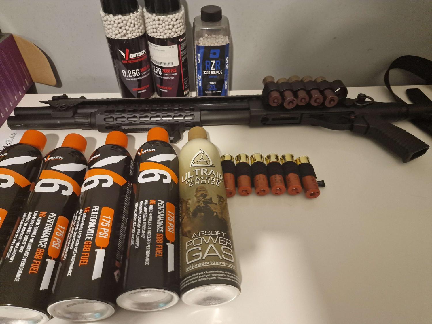 – Golden Eagle Type 870 M8875 Tactical Railed Gas Shotgun – Used 4/5 times? and most of those were half days. a few scracthes from the loader(Nothing you can do) and some on the barrel for leaning.