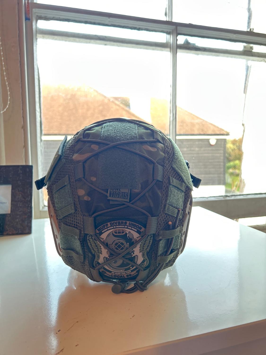 Unknown brand helmet, one Tigris MCT helmet cover, FMA helmet mounted eye pro, and helmet mounted mandible.