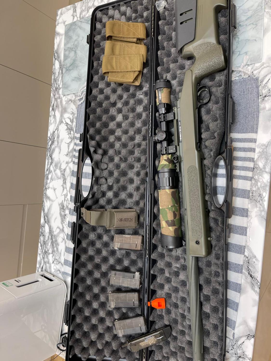 Novritsch SSG24 m40a3 stock . A very limited edition. Both the rif and the stock are not available any more . It has new hop up bucking and it’s been serviced. Comes with m130 spring brand new . It comes with 4 mags and pouches for the mags . Speed loader with attachment from tridos for loading the mags and cap for unloading the mags to a novritch bottle . Bipod not included in the sale . 500£ collection from Nottingham or special delivery buyer pays for postage. Please message Antonis 07778 809750