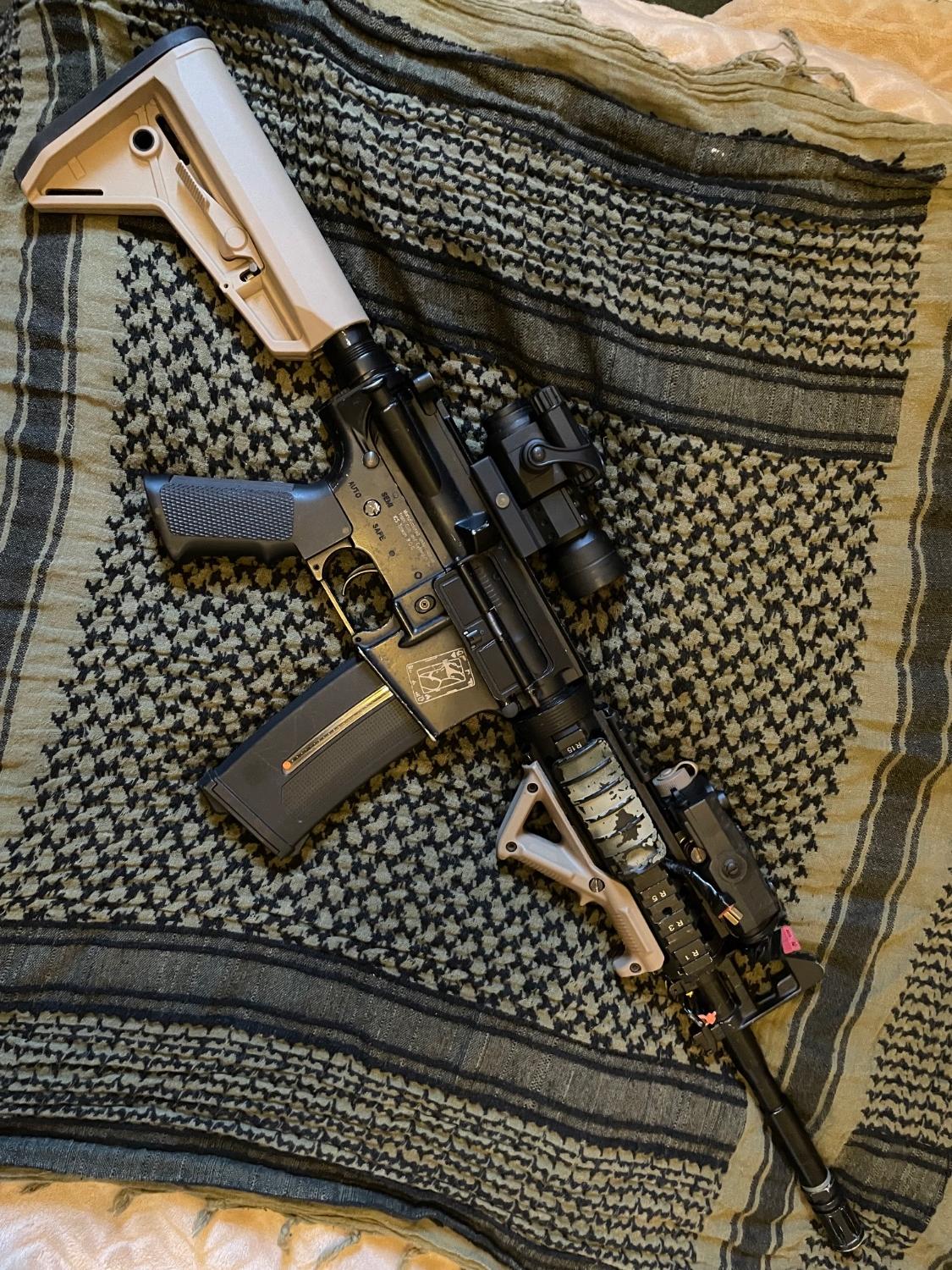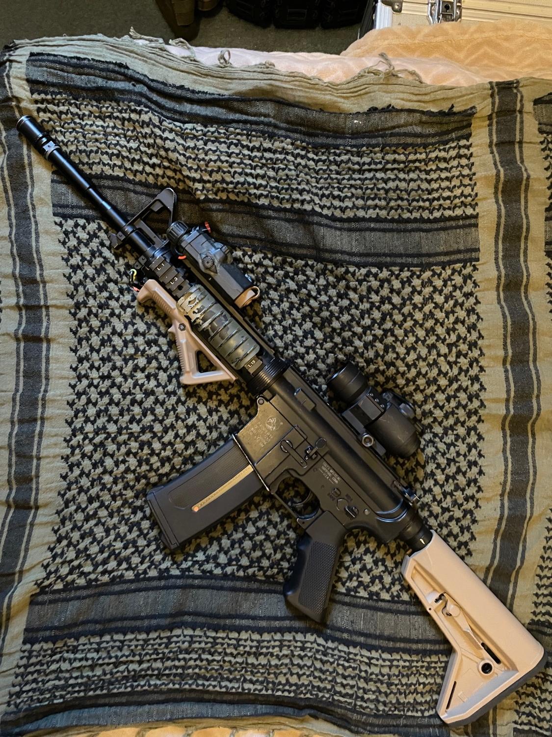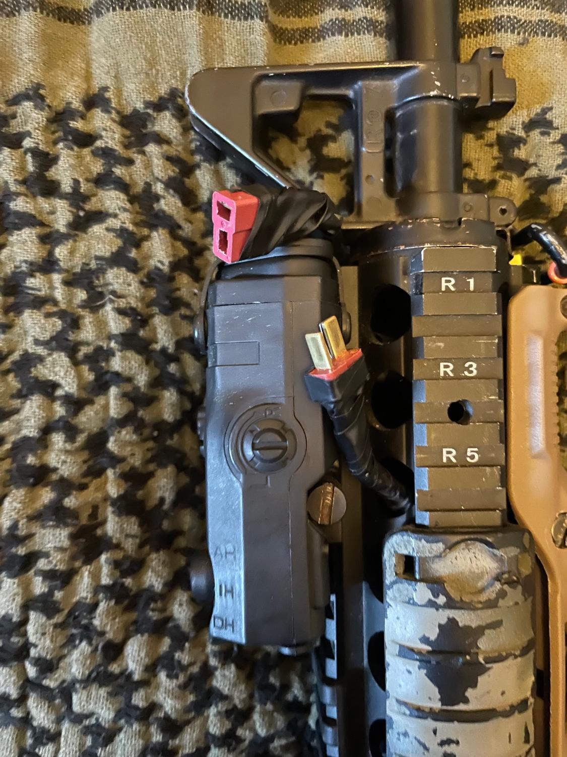 It’s set as a DMR doing about 430fps with a .20 I normally run .36bbs it’s fully upgraded with 6.03 tight bore and a maple leaf bucking and R-hop mod. There’s a 40k high torque motor in there and a Gate aster mosfet installed. All the air seal parts have been upgraded don’t ask me what make the parts are coz I don’t remember. It’s tuned up great. I’m selling coz I need the money. Don’t really want to let it go. It comes with 1 PTS EPM1 250round mid cap. and 2 11.1v lipos. It’s front wired just change the battery in the peq box on the front rail. Wired to deans.