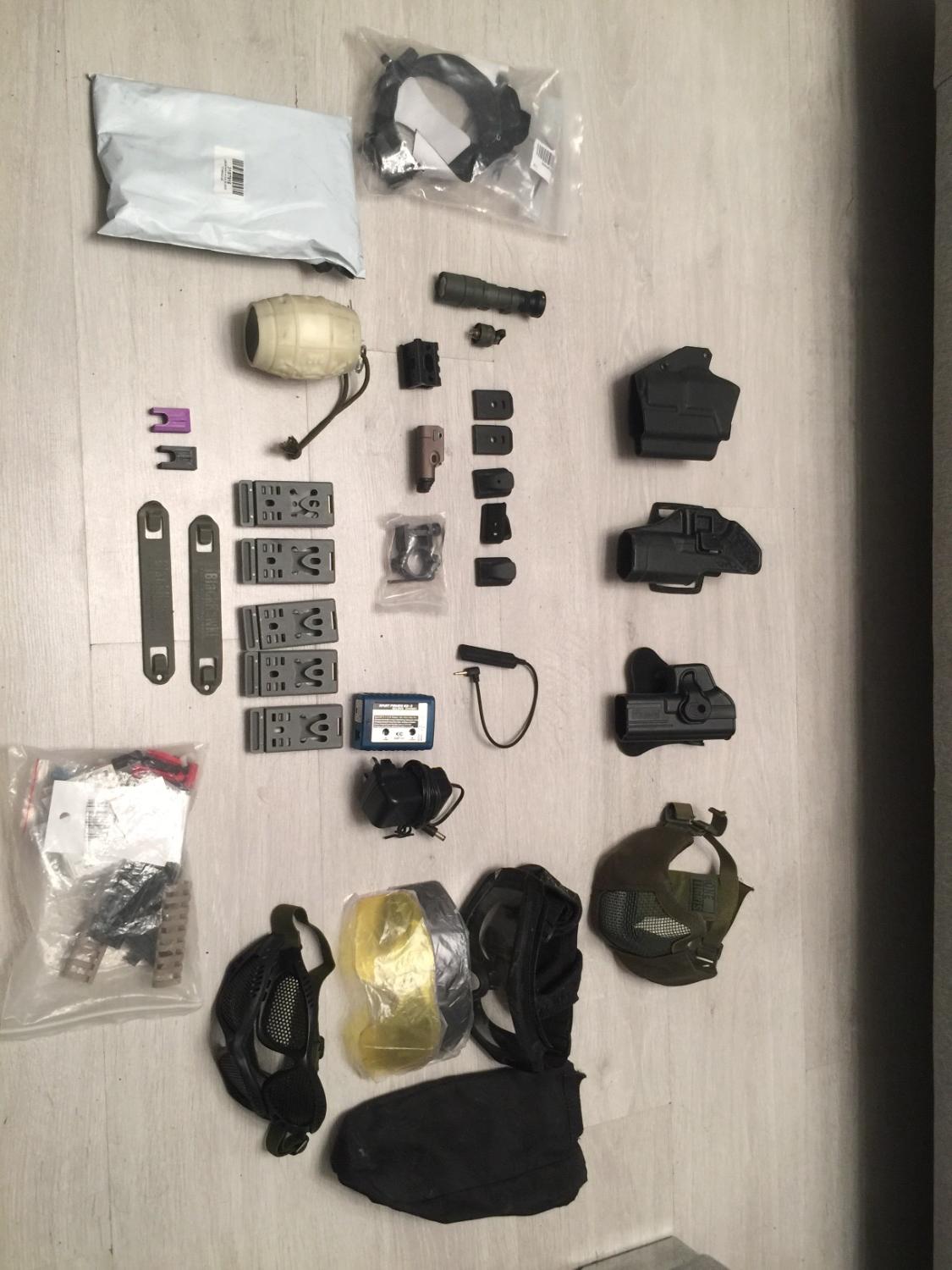 basically everything you see here including the misc stuff like speed loaders, pouches, holsters, belts, torches, hop rubbers, riser, base plates for mags, fma helmet setup with comtacs helmet cover ect, idogear belt set up with lots of pouches,delta mike face pro, revision sawfly with multi lenses, other eye pro mesh ect, dump pouch, safariland glock holster and drop leg, just everything here buyer pays postage
