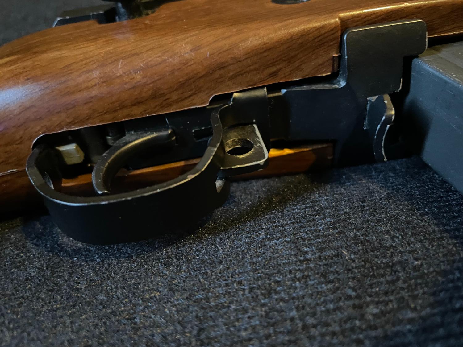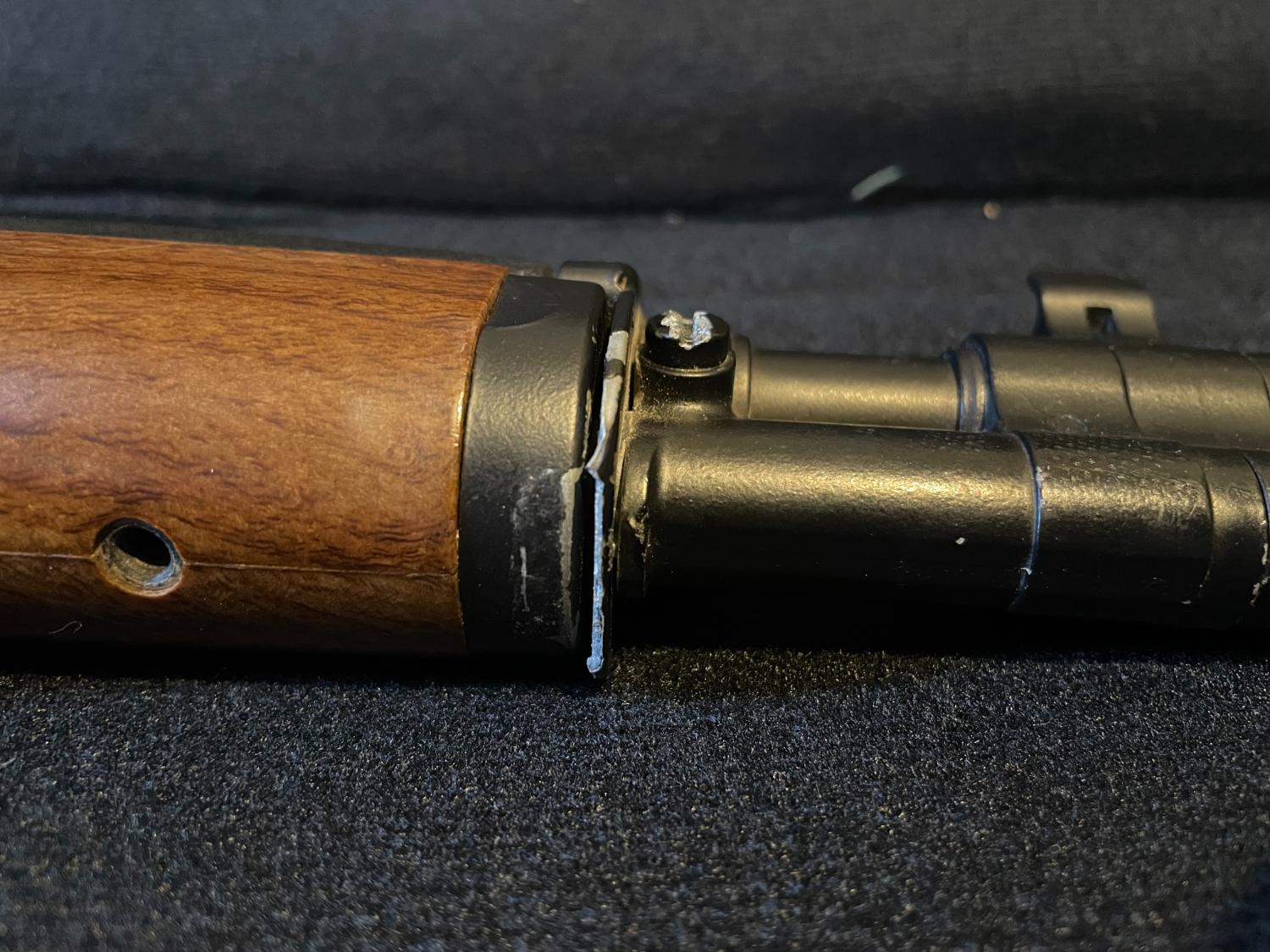 The stock is plastic with a faux wood effect and it likes to try wiggle a few millimetres back, but it holds steady. The end cap around the barrel that overlaps the two parts of the stock down at the muzzle end has snapped off as shown in the pics and might be responsible for some of this stock shifting.
