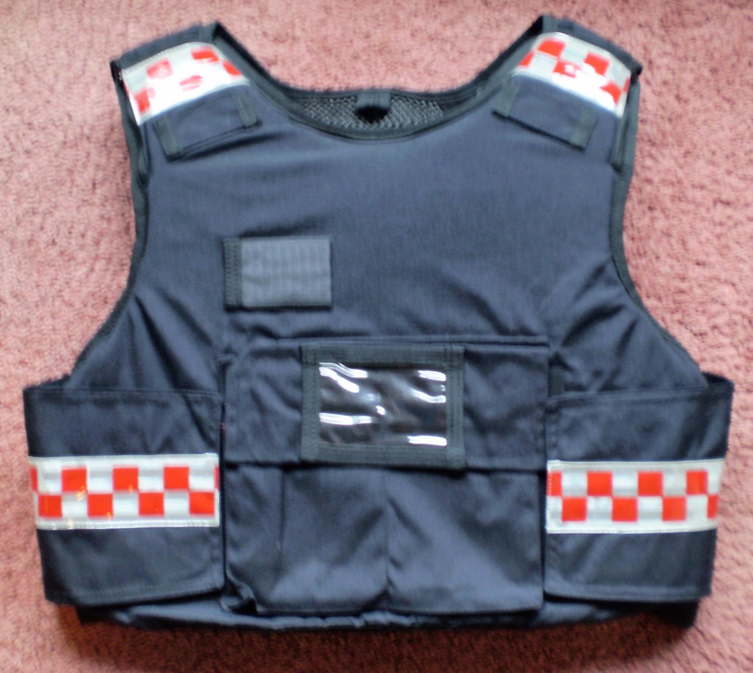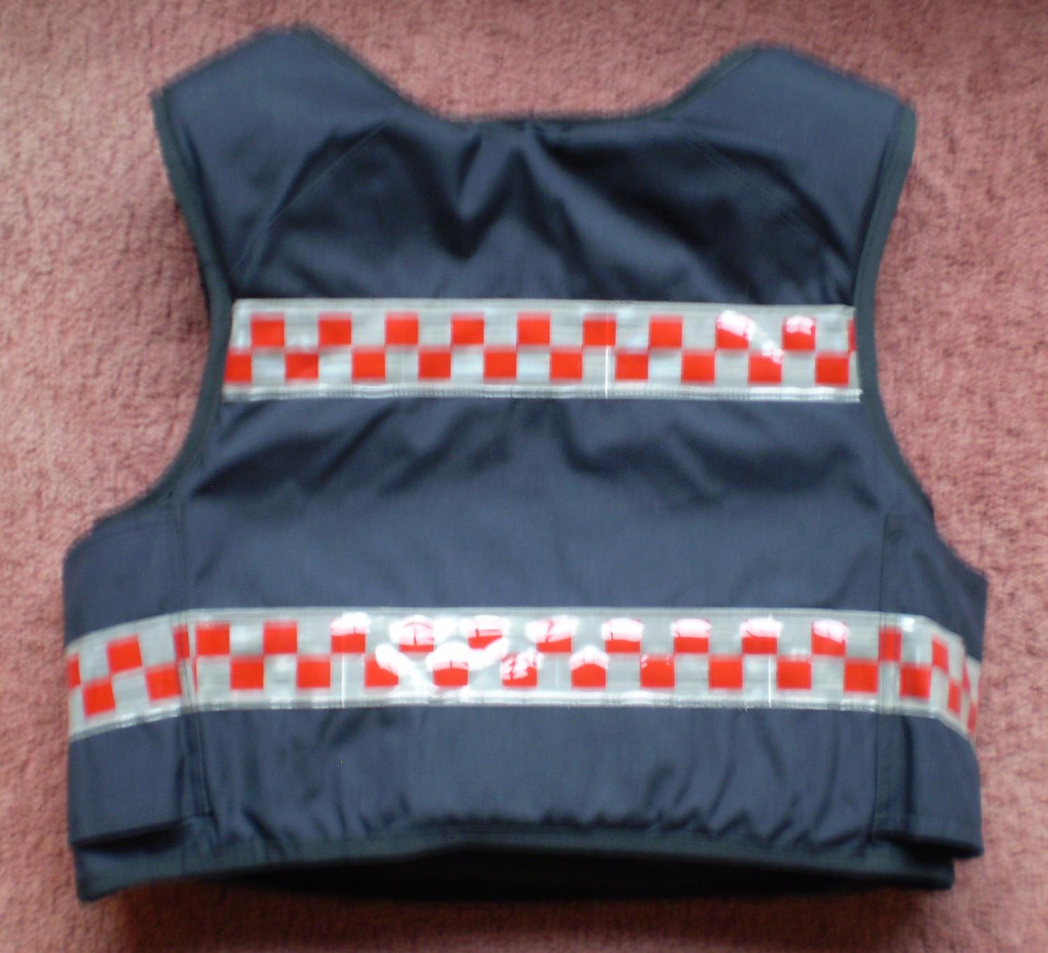 Security / Police body armour from Global Armour. Very light weight as contains foam inserts (no real ballistic armour). Has extra removable padding at shoulders and small of back. Surplus item in excellent condition. (£6.00 postage)