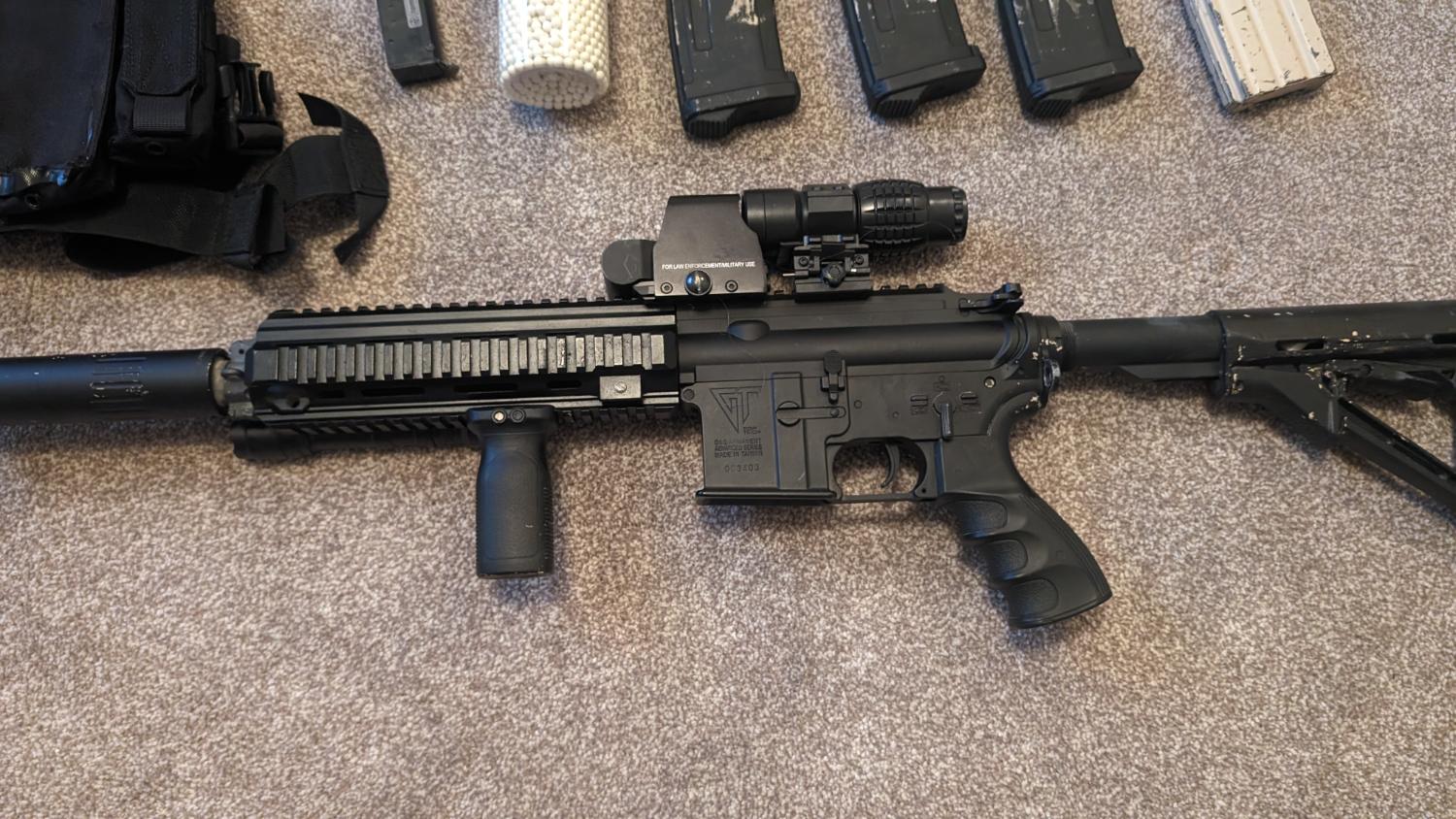 Includes custom flash hider, Advanced armaments suppressor, Magpul PTS multipoint stock, Stubby foregrip, Taclight, 3x Mid Capacity mags, 1x High capacity mag, EOTech style sight, plate carrier with triple mag pouch, speed loader, BBs and gun bag.