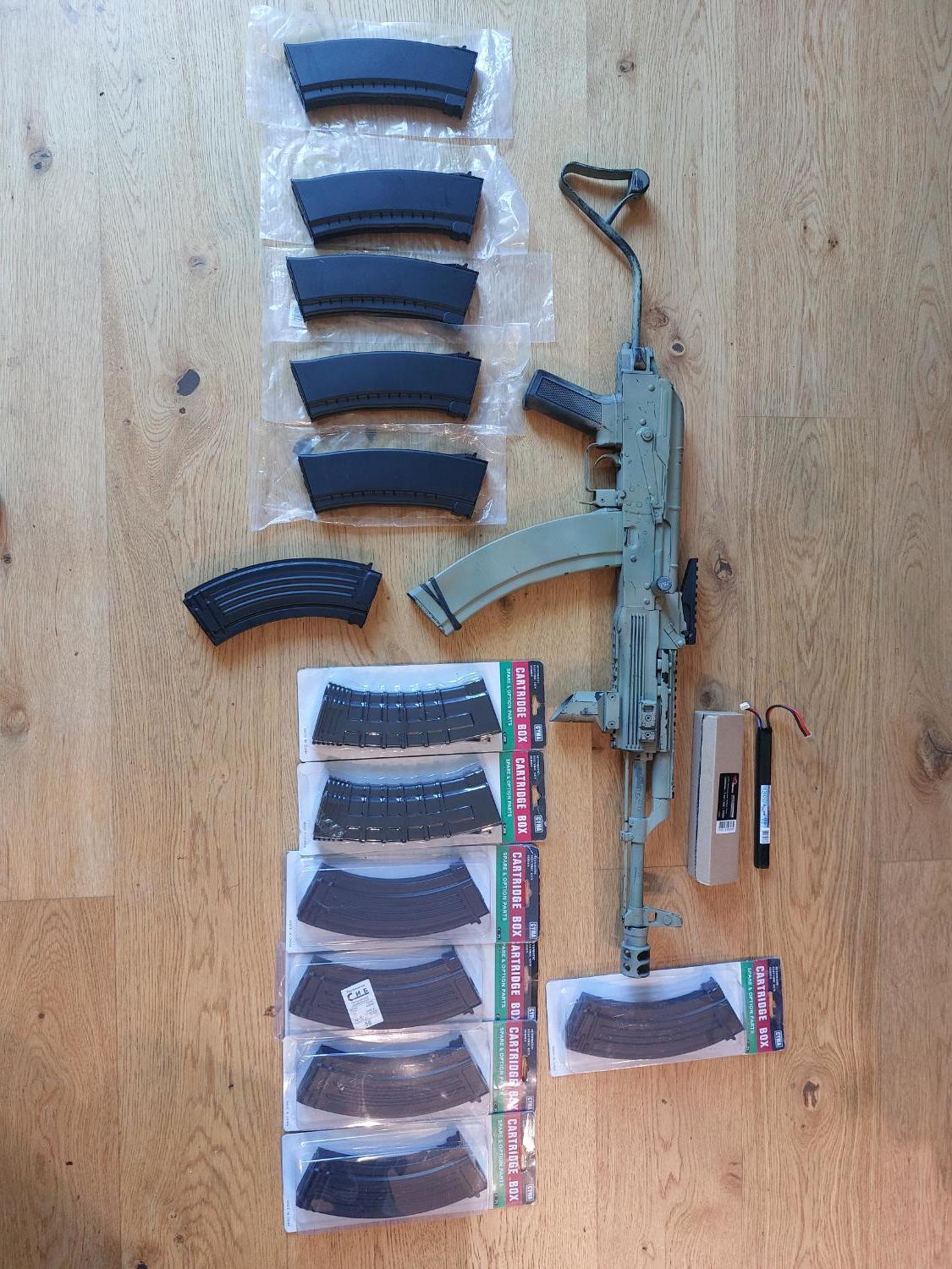 14 mags, 2 7.4 lipos, 5KU grip, 5KU flash hider, scope riser