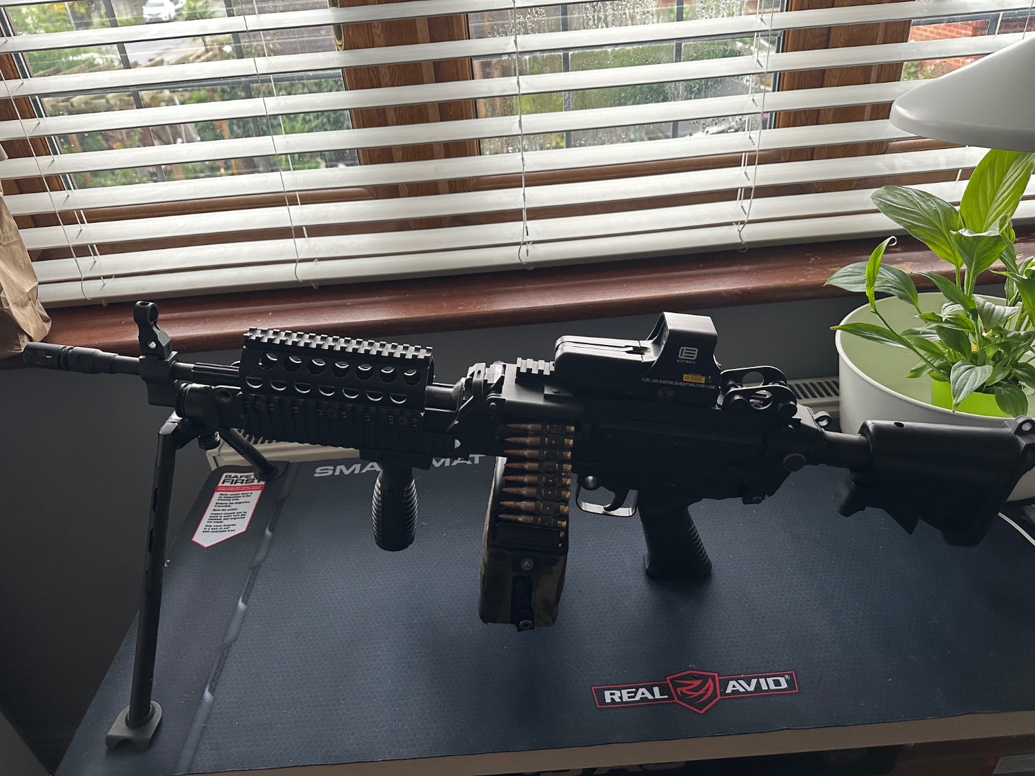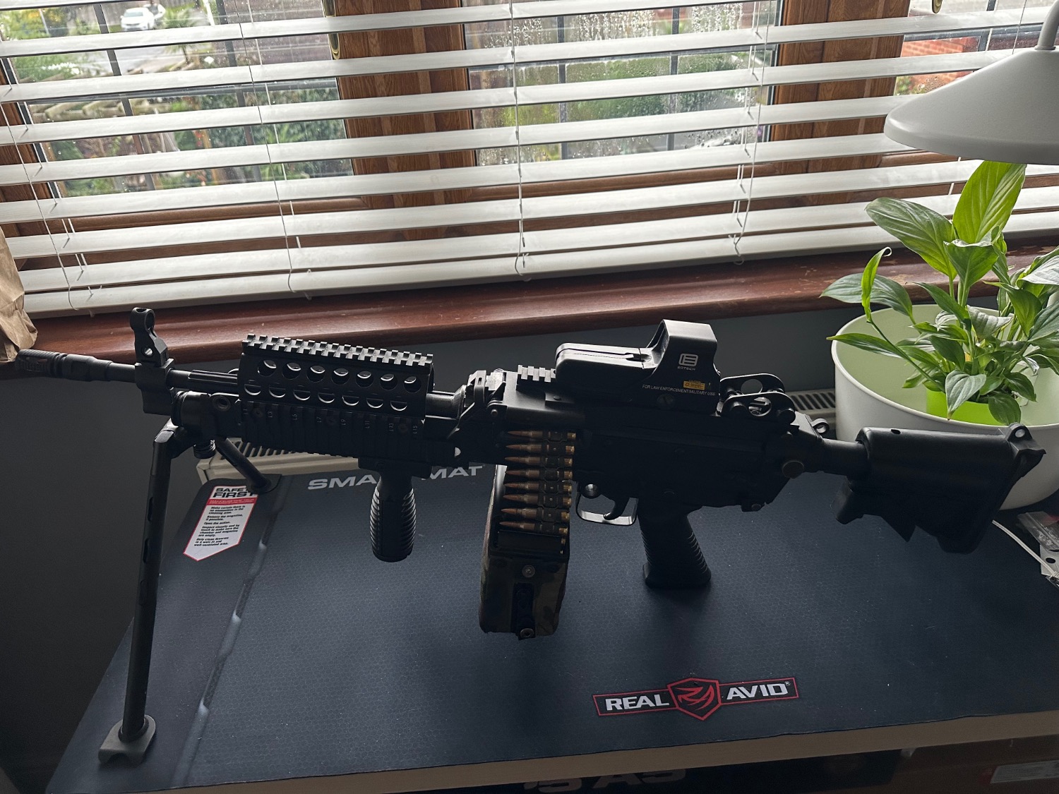 My tm mk46 with full upgrades from camo raid, edgi barrel , eagle 6 piston , eagle 6 90 spring camo raid spring power spacers and camo raid Cnc gears. With two box mags. Original mk46 bag. Used 3 times.