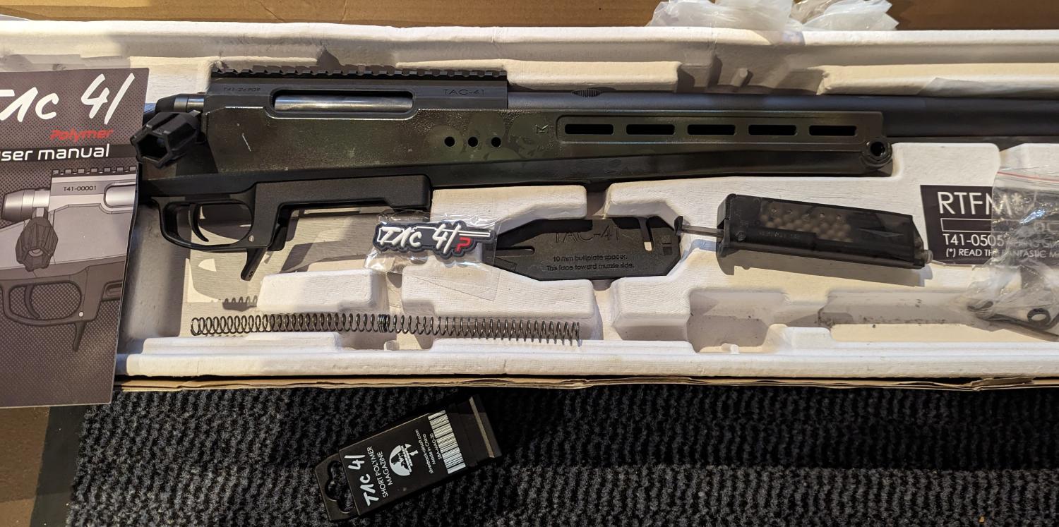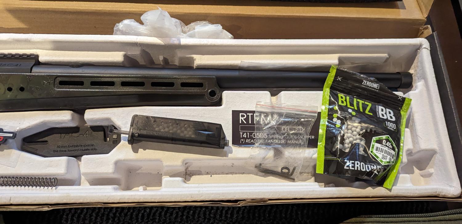 The rifle has only seen one game and has shot around 350 bb's, only upgrade is the spring, stock has been sprayed in camo colours.