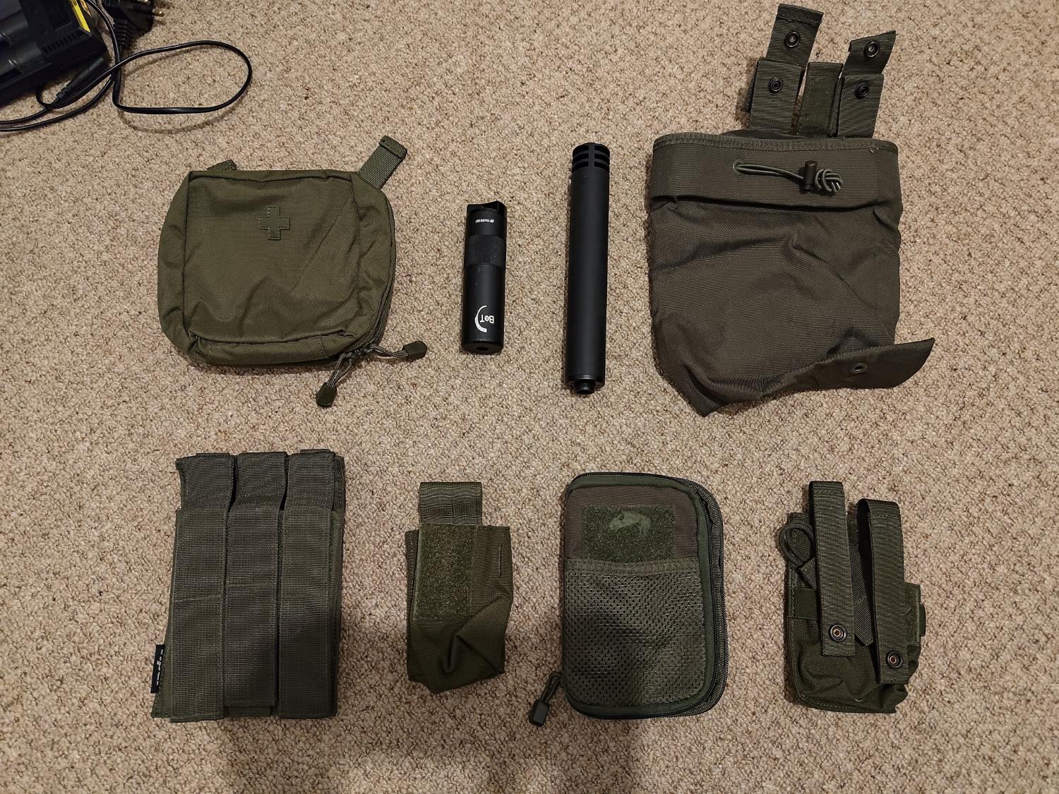 Various OD Green pouches, ASG Tracer & FMA Hunting Suppressor