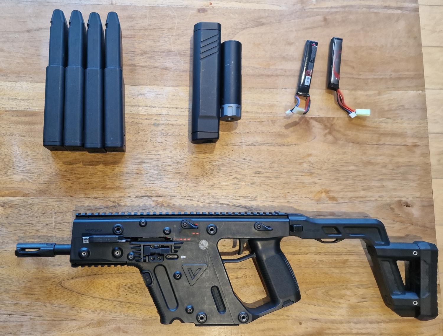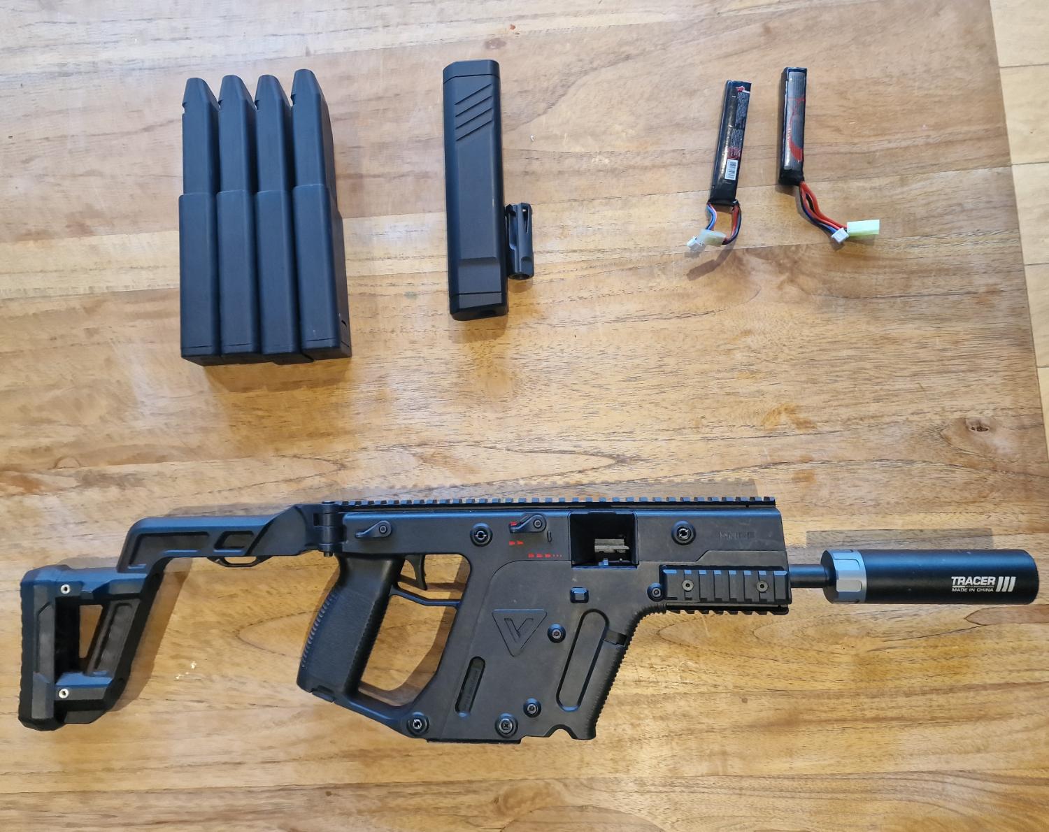 Here we have my ahardly used Kriss Vector. Hasn't seen much use since I switched to HPA so unfortunately it's time to sell. Great little CQB platform. It comes with Nuprol tracer unit, silencer, qd front grip, 2 batteries and 4 95 round mid cap mags.