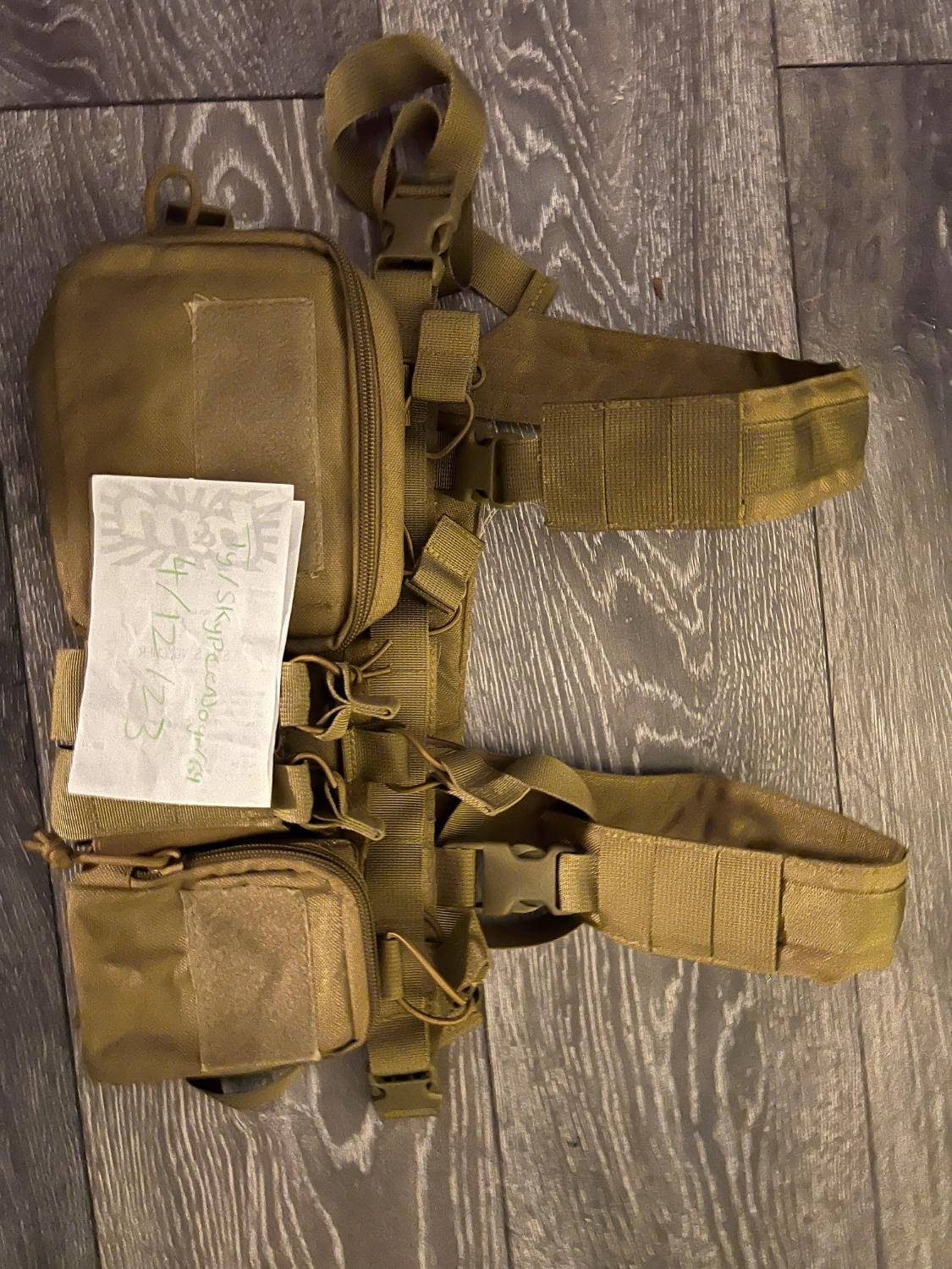 Bog standard chest rig, fits 3 m4 mags 2 pistol mags and has two small bags, has velcro if you want to attach a scrote pouch.