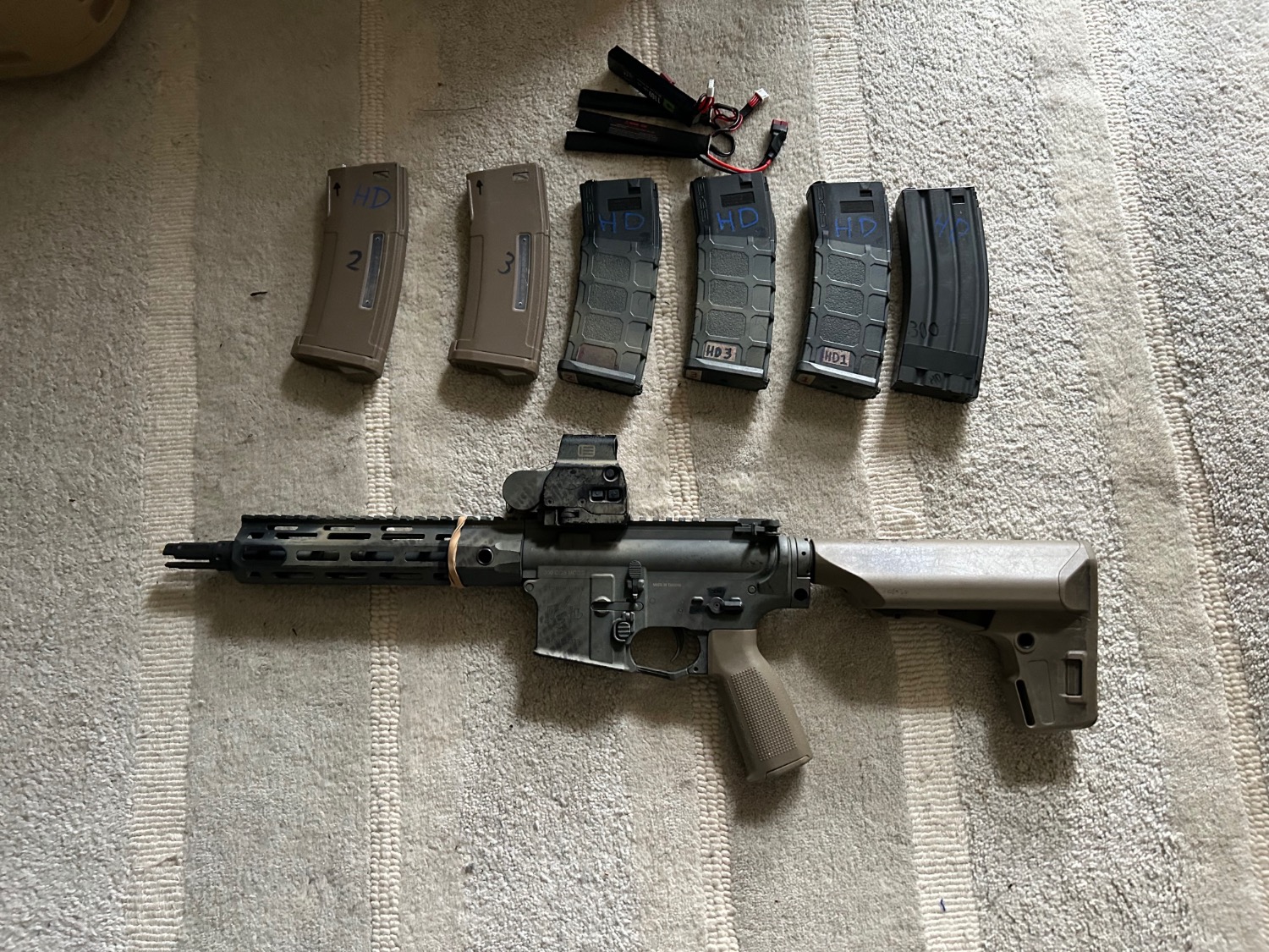 Comes with everything seen in the photos (except the batteries as they’re dead), including a repro eotech (just a cheap one but hold zero), and 6 mags (4 g&g ones which will cutoff when empty, 2x battle axe epm style midcaps)