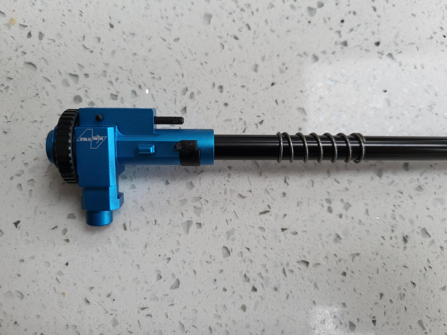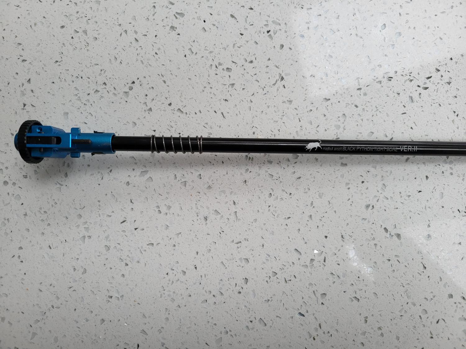 I bought this used through here a few years ago. Unfortunately it came with a screwed hop unit and stripped piston, which was not advised. Had to replace the piston and the hop. Fitted a Pro Win rotary hop and took the opportunity to add a Mad Bull 6.03 tight bore barrel. Inner barrel is slightly longer than the outer, but is hidden within the flash hider.