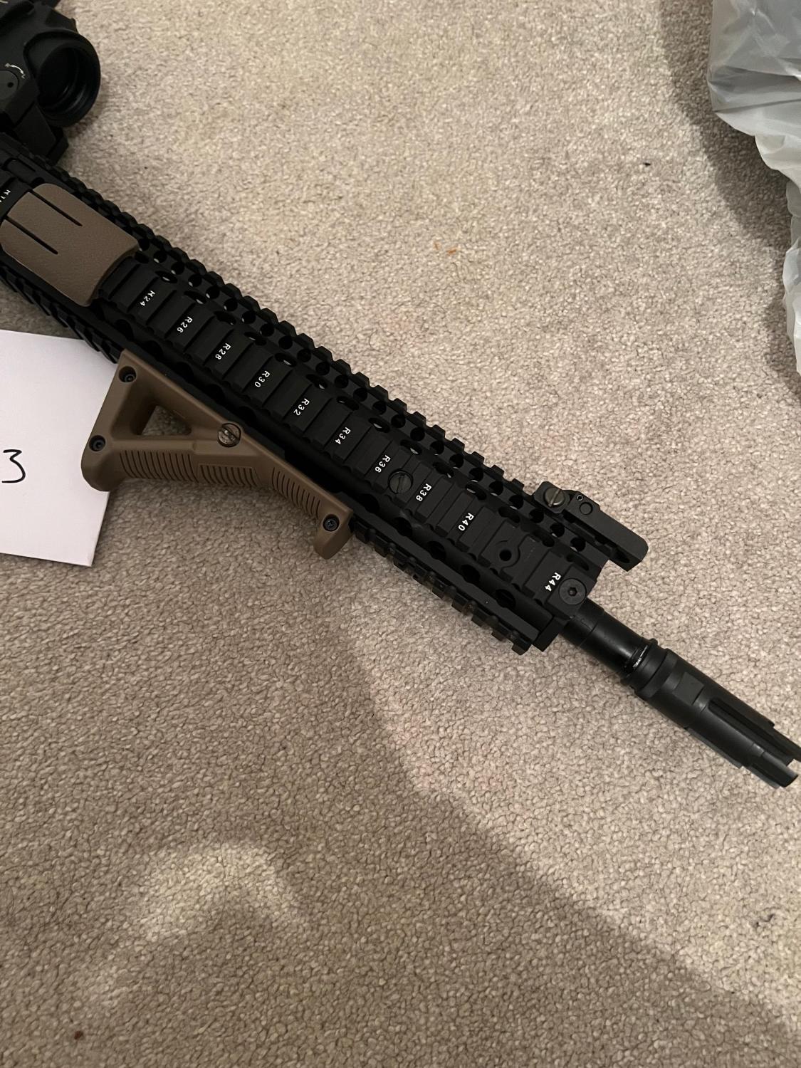 WE 888 (416) gbb that was converted to a mk18 and then a block 2. Mag is probably leaking, don’t have gas to test this. Npas required for skirmish. Had this for nearly 5 years never been skirmished been kept in storage. Apart from the seals and some surface rust everything mechanical is in good working order. Will ship with madbull mk18 rail, angled grip and Elcan replica with dr sight on top. Also has angry gun sf 216 flash hider, radian charging handle, magpul style ASAP, pts epg and more style stock. Spent close to £1000 on this over the years, would be a nice project for someone to get it going. Asking £350 open to offers will post anywhere in UK at buyers cost. Thanks