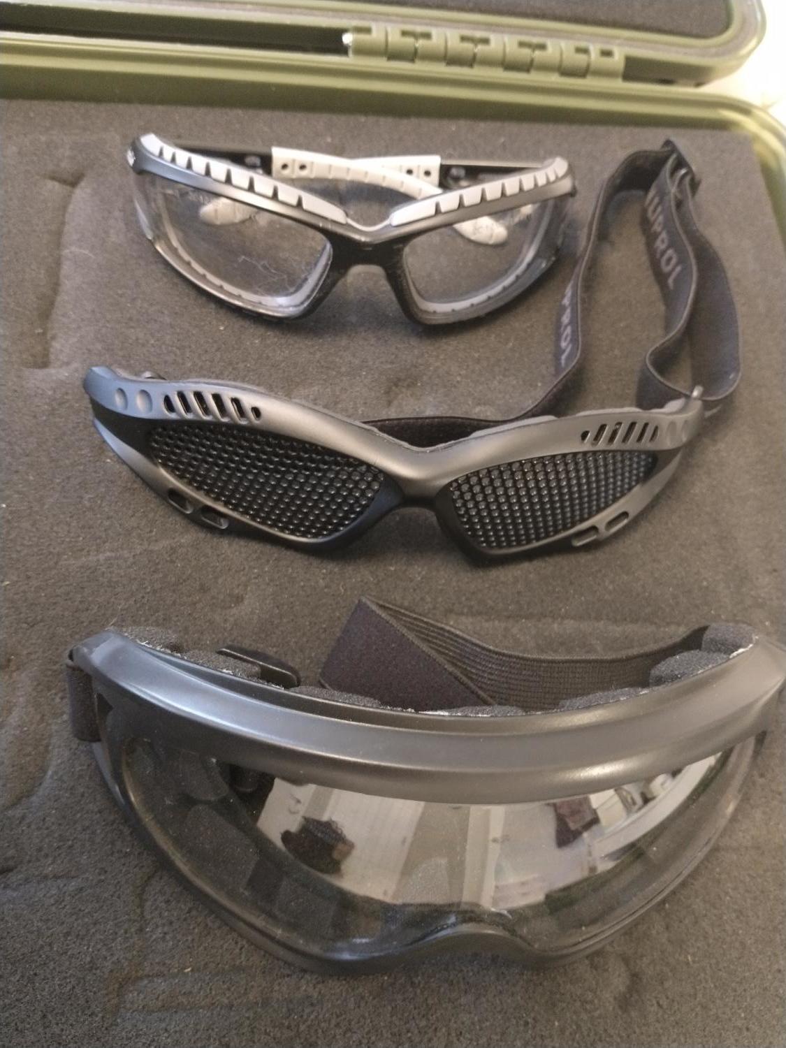 Three sets of eye protection including a pair of Bolle Tracker II Glasses.
