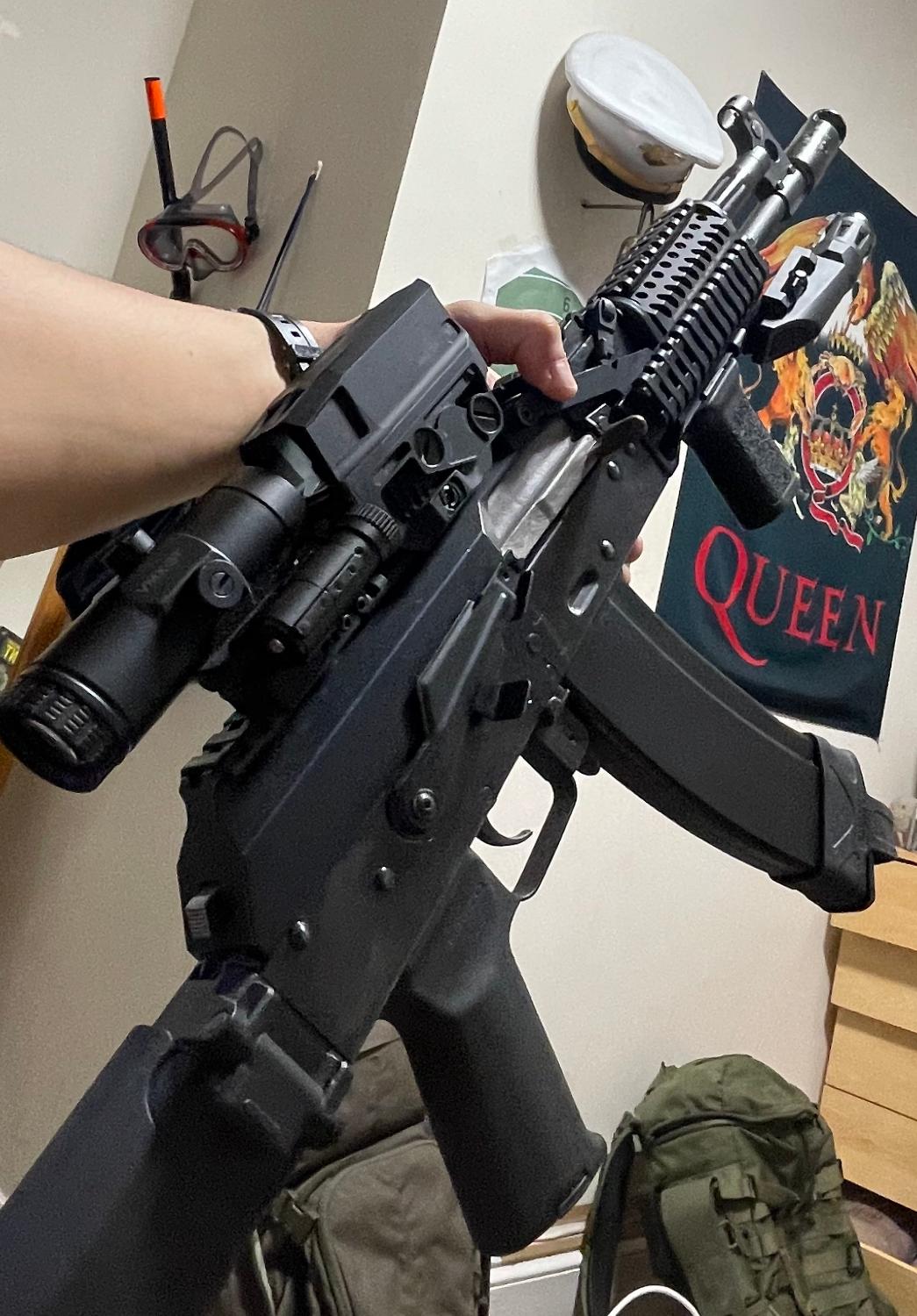 The base was a GHK AKM, pre 2018 model, which I have lovingly adorned with full zenitco parts and a naughty magpul zhukov stock and MOE grip. To top it all off, a romanian style closed front sight block and 74 pattern muzzle brake. Truly one of a kind and will leave your local AK fanatics both confused and aroused.