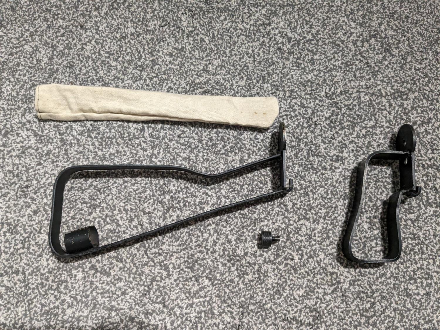 Also included is a repro STEN sling as well as 2 alternative stocks, a different skeleton style stock and a pistol grip (I bought these from a friend of mine and have yet to get around to modifying them to work with the gun, they'll need work to sort out battery storage!). The two alternative stocks are quite crudely made from folded/welded steel so could do with some extra finishing on the edges and perhaps a fresh lick of black paint. I also have original thumb screw that retains the stock, I replaced this with a button-head allen screw due to personal preference but this could be swapped back if you'd prefer. Hop is adjusted with a 2mm allen key (not included).