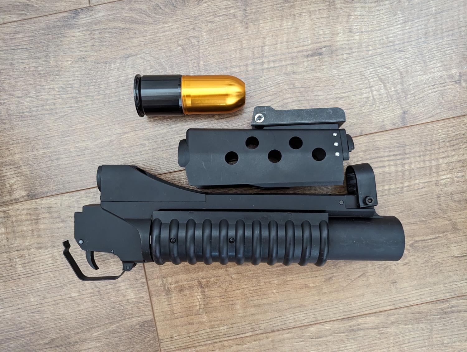 An E&C M203 grenade launcher with a G&P M4 / XM177 handguard and CO2 charged moscart.