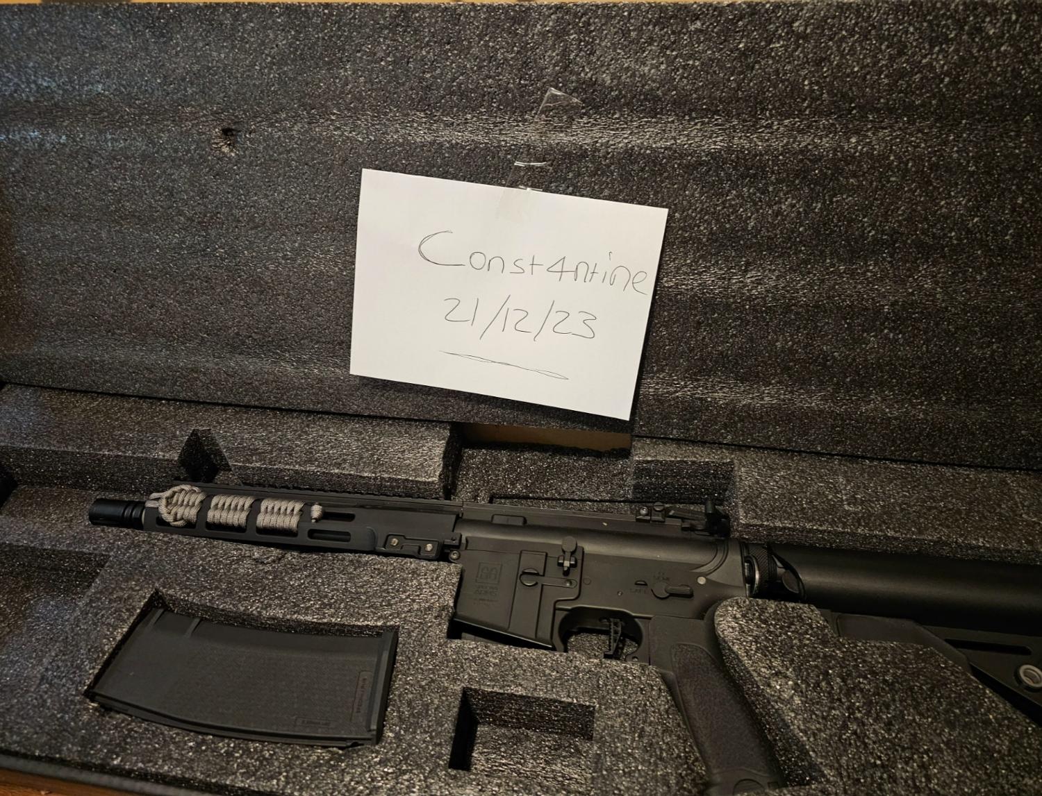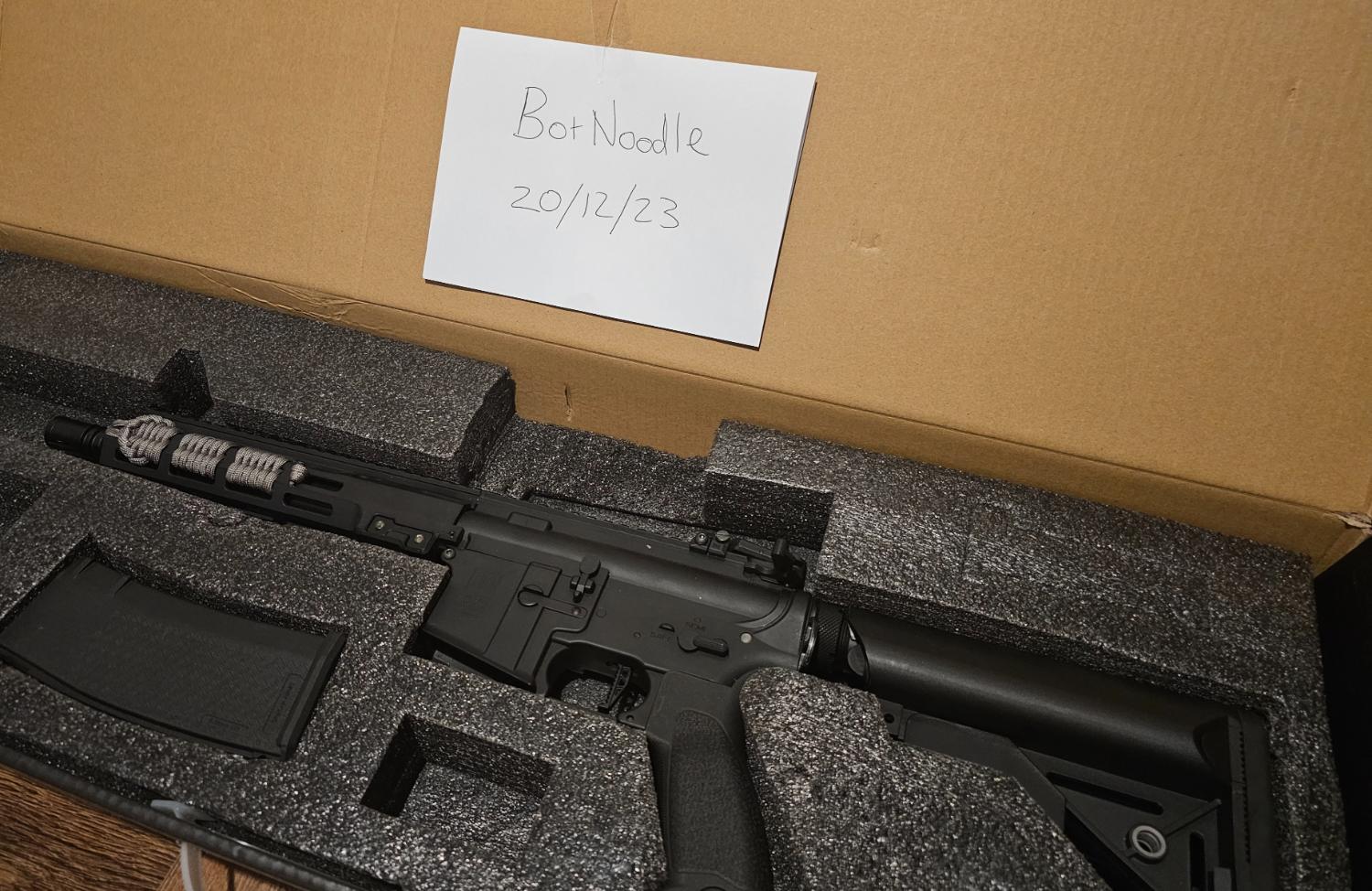 7 months old and only used on 2 or 3 game days (tend to resort to the hicapa). Fires like a dream, a great first RIF! Have braided the handguard with paracord but can be removed super easy. Gun and mags only (no batteries etc.)