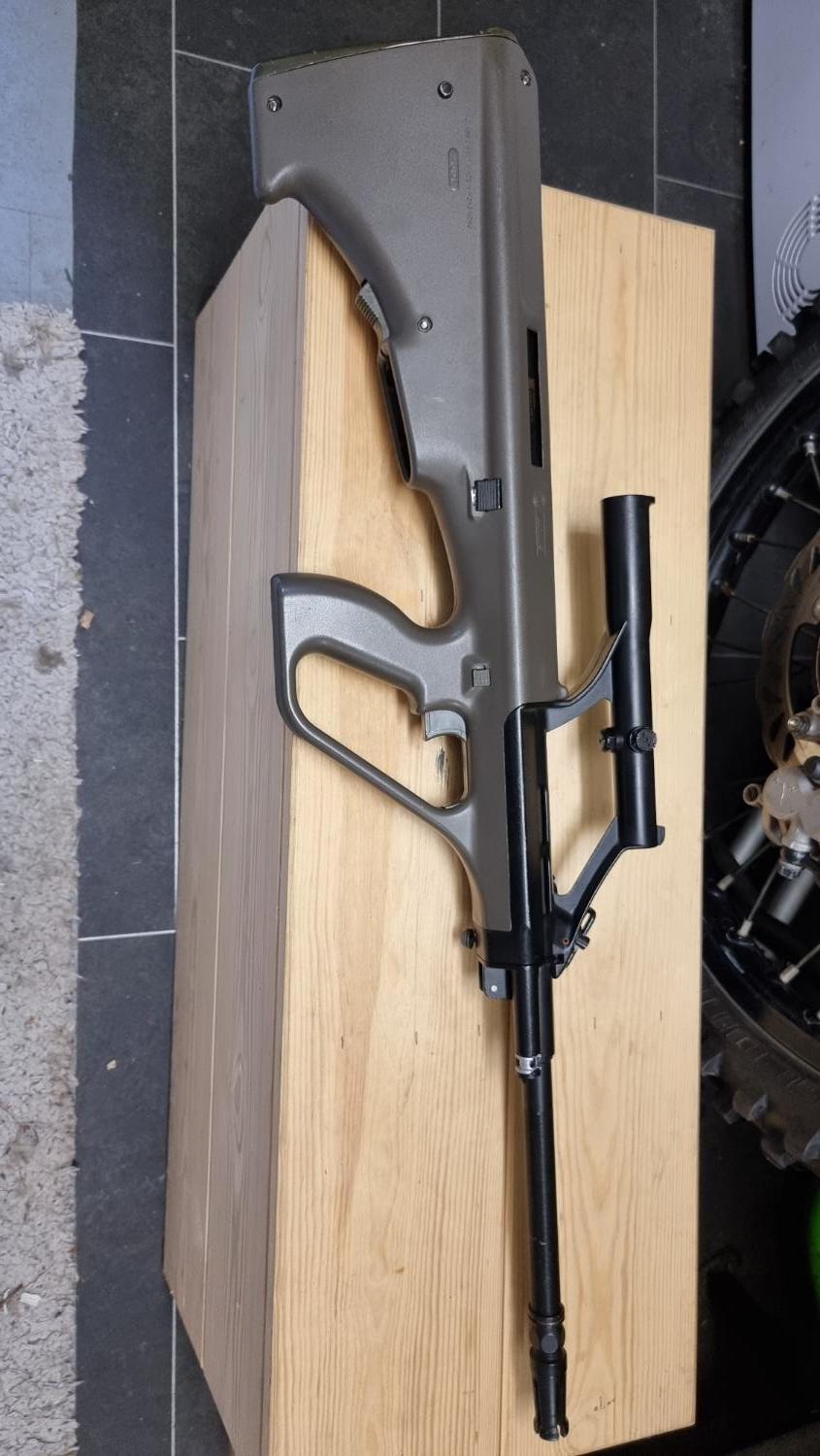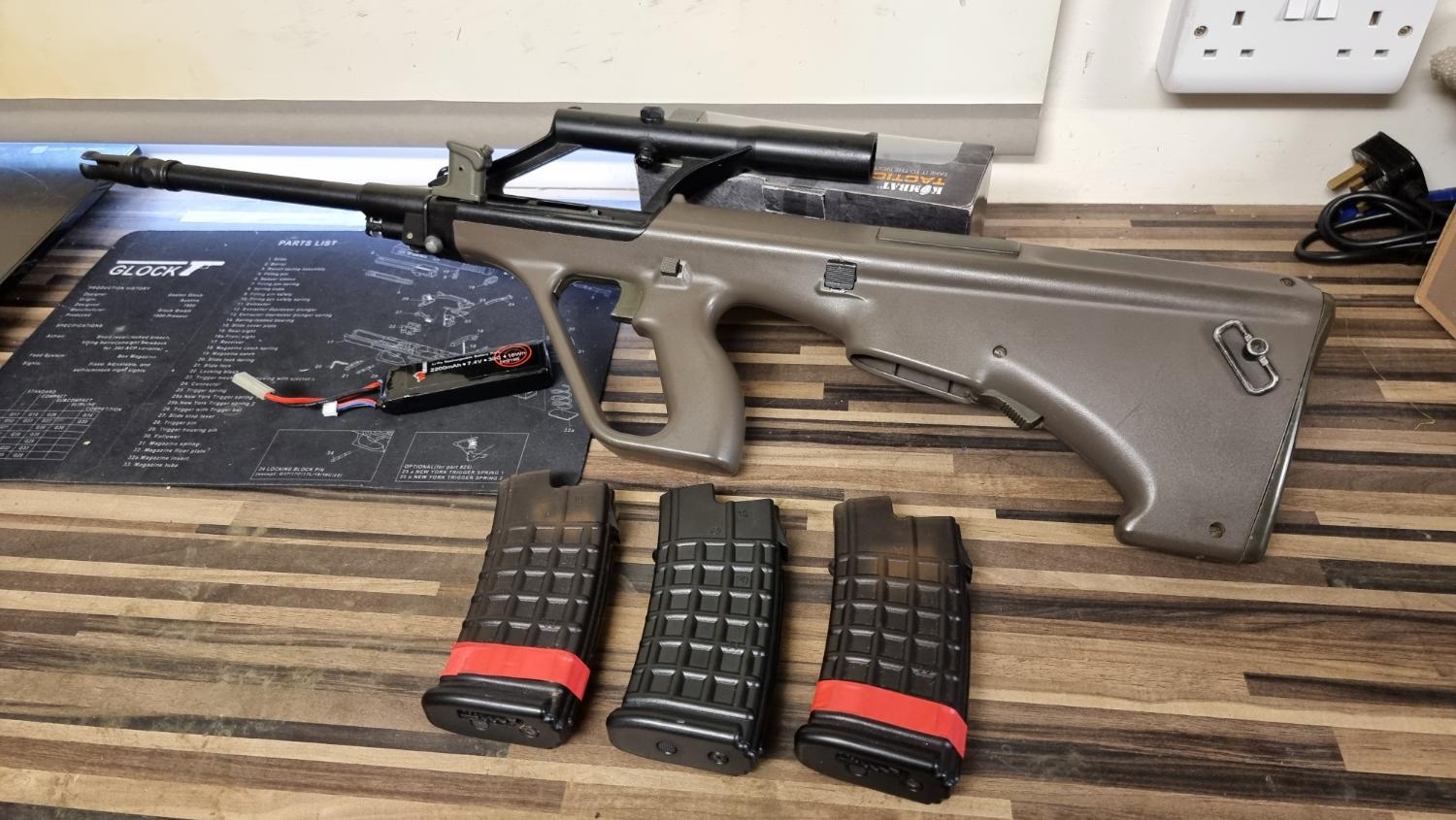 aug a1 forsale been serviced and have new fps hop rubber and nub and tight bore inner barrel, comes with 3 mags and battery. shooting 286fps 1.06 joules on .28. Foregrip is missing, the body pin isn't original.
