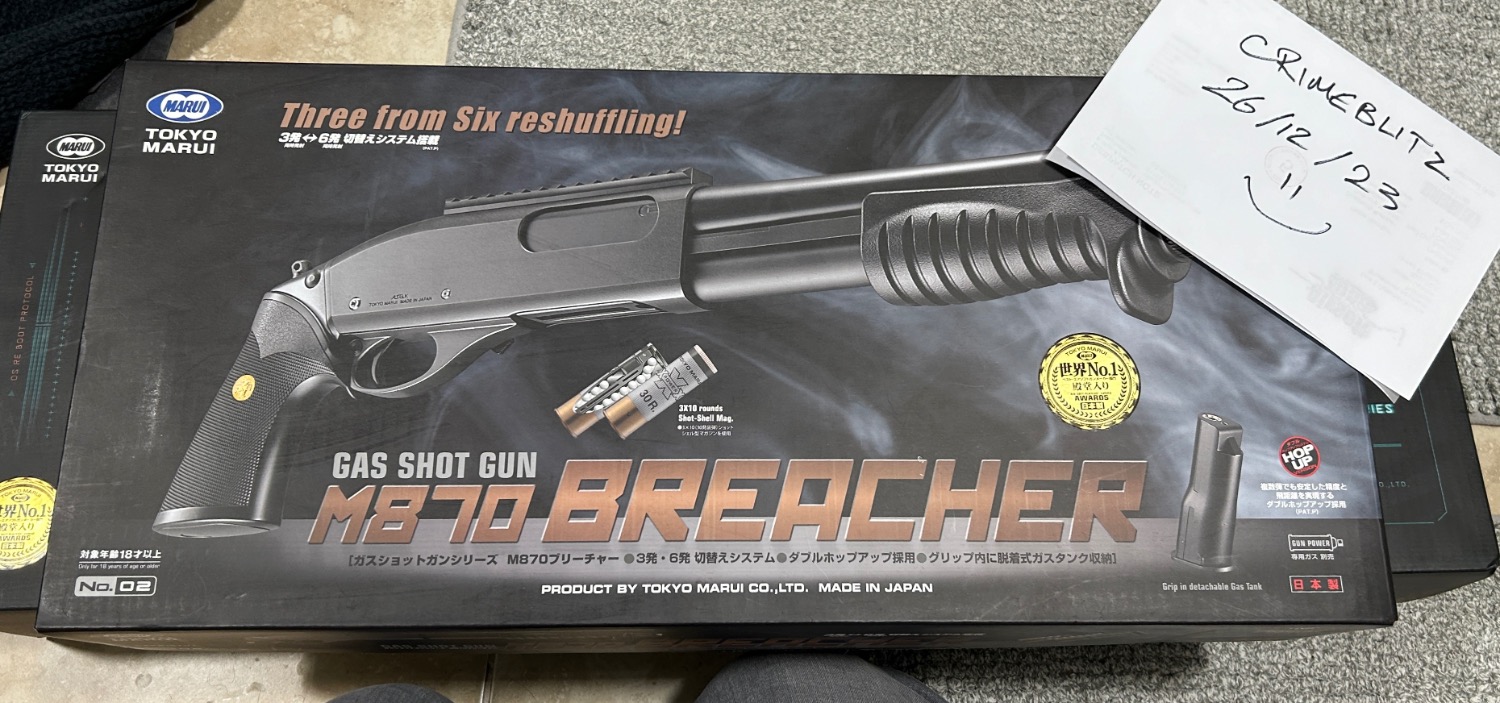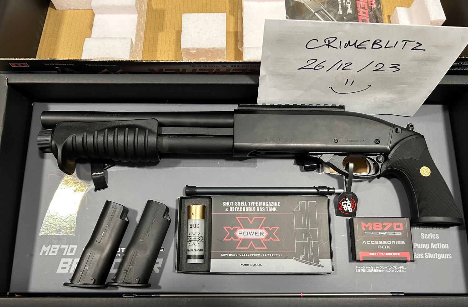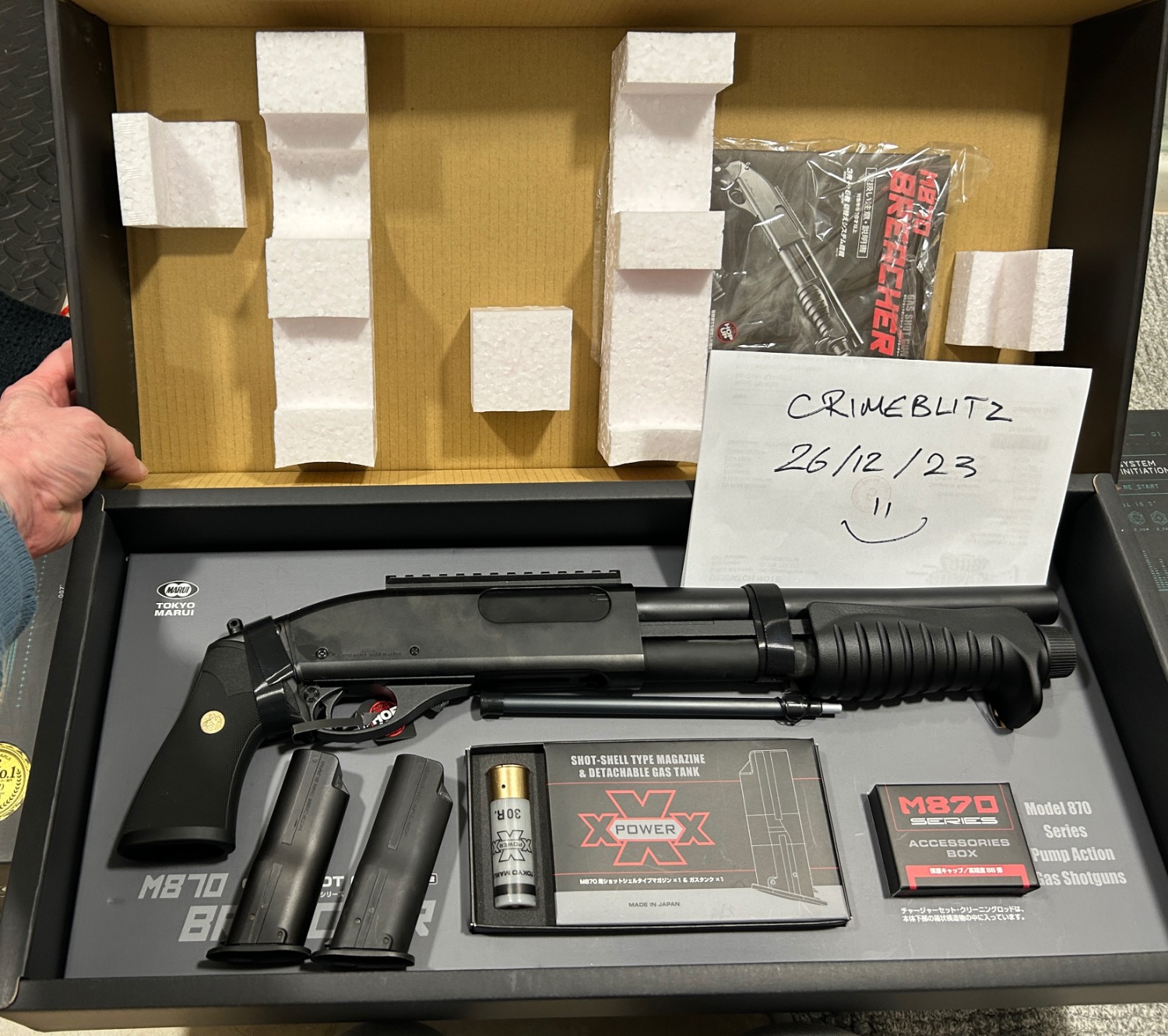 It comes unmolested in its original box with the original shot shell magazine and all the usual bits you would expect with a brand new TM, plus an additional gas tank!!