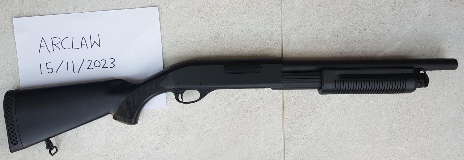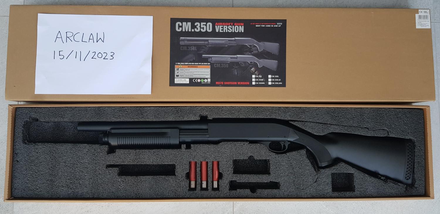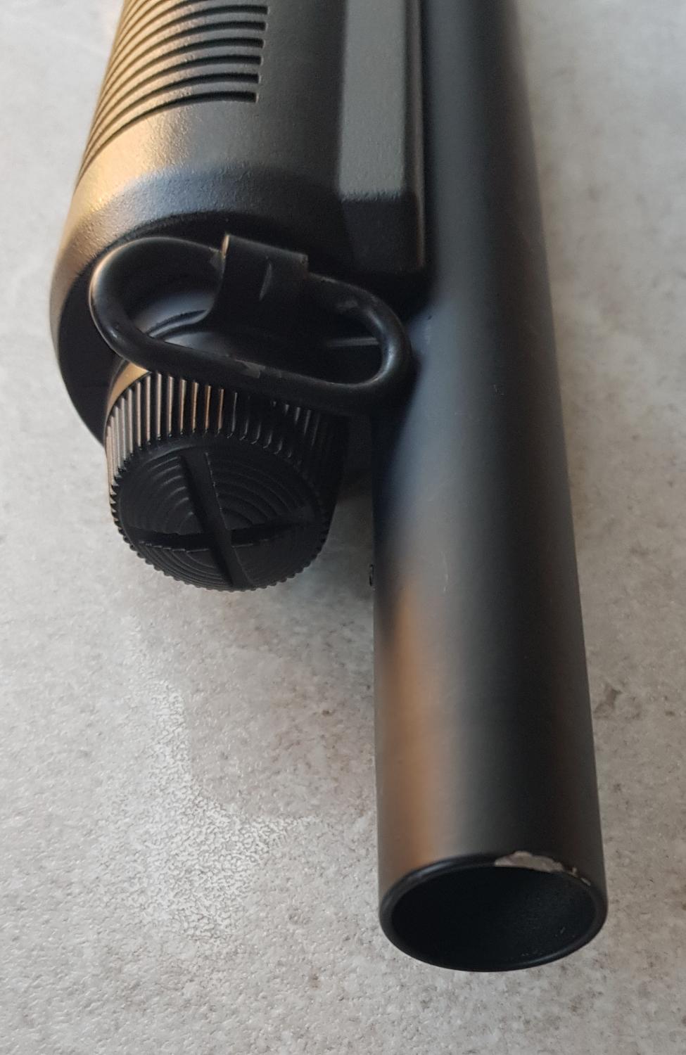 For sale: CYMA replica Remington M870 tri-shot spring shotgun. Skirmished once, in good condition other than a chip to the paint on the muzzle (see photos). Sale includes original 3 shells and original box, a 2-point sling and a fabric stock shell holder. Photos show dates from November when I first considered selling.