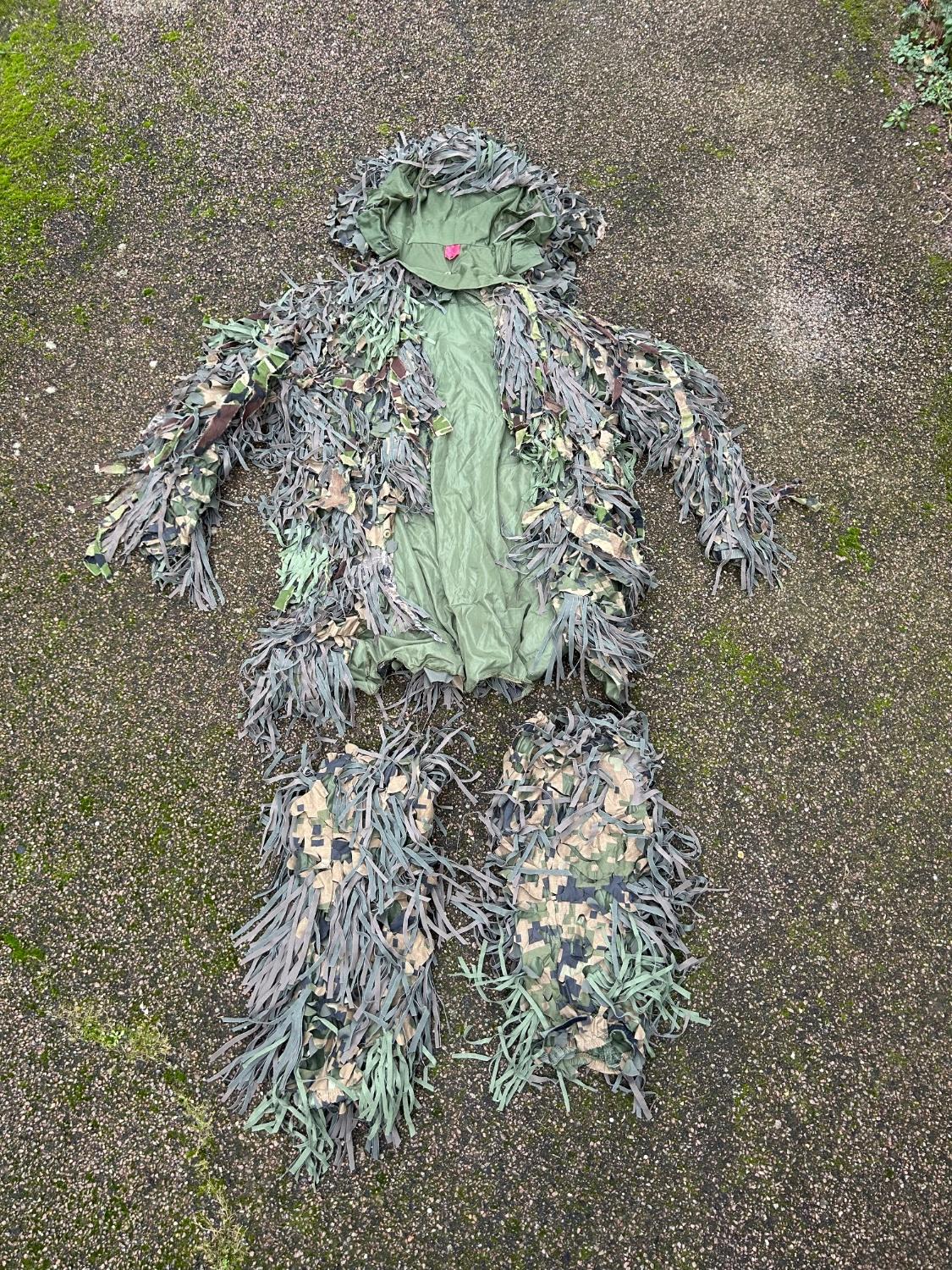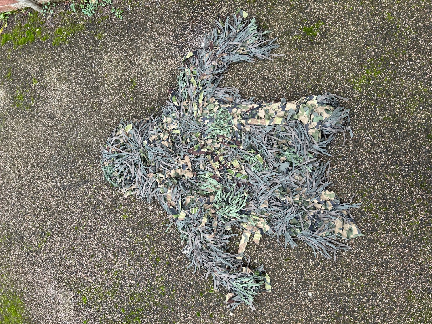 The ghillie suit is in really good condition with minimal signs of wear, there has been some British DPM Woodland material added to the suit in places (see pictures) which makes for an additional darker tone being added to the overall camouflage. The ghillie suit is sized as a Medium / Large, of which it is true to size. As pictured the ghillie suit comes with an upper jacket type section with removable hood and buttons across the front, with two additional leg covers meaning it can be used as just a shoulder coverall or a full suit if required!