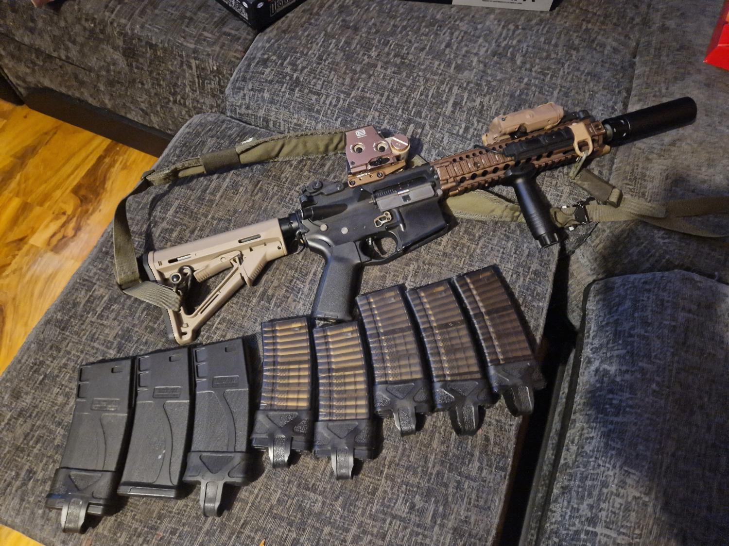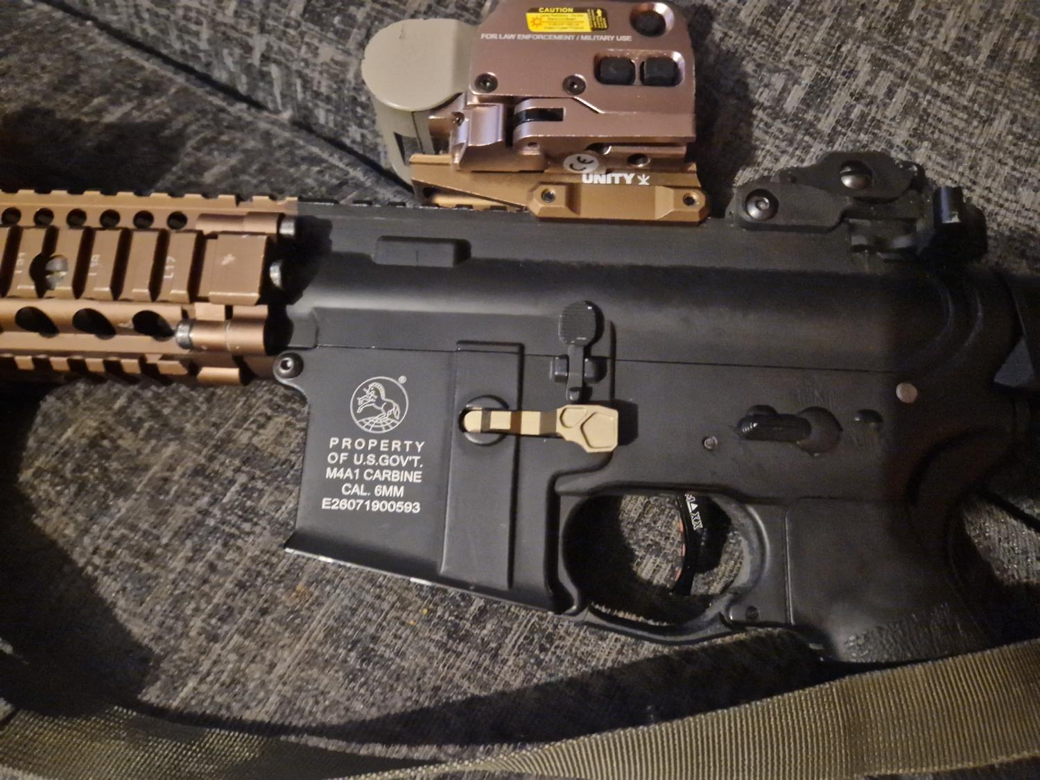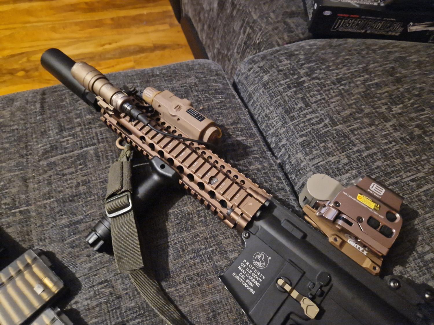 Cybergun colt m4 mk18. Genuine madbull mk18 rail. Gate titan, 12:1 gears, ultimate 40k motor, maxx model trigger, maple leaf super silicone hop rubber, flat nub and tight bore barrel. Ctr style stock, magpul style pistol grip, ambidextrous mag release, unity riser and eotech style holographic, dummy peq box, element torch, magpul style sling point, surefire rc2 style quick release suppressor with actech inside! 2 point sling. Great rof and trigger response! Comes with 5 emg lancer 190rd mid caps and 3 guarder 140 mid caps. Shoots around 320fps. £350 NO TRADES