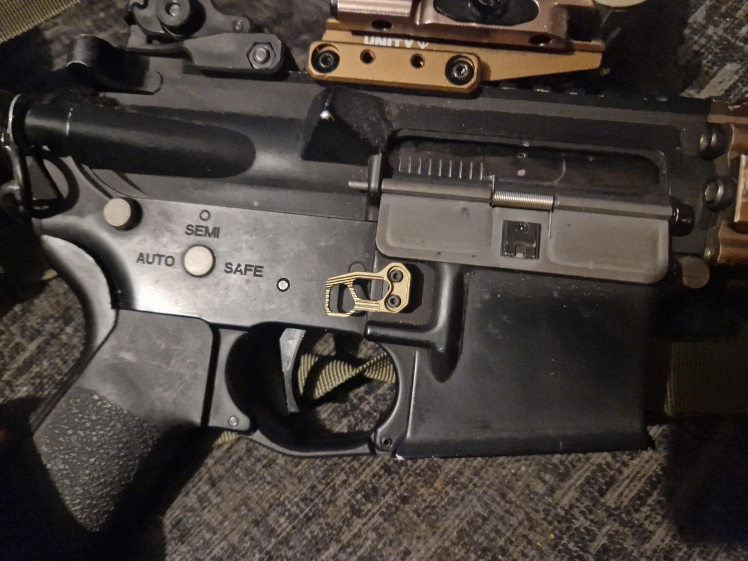 Ctr style stock, magpul style pistol grip+sling point, ambidextrous mag release, unity style riser, eotech style holographic, dummy peq box, torch, rc2 style quick detach suppressor with acetech tracer inside, fore grip.