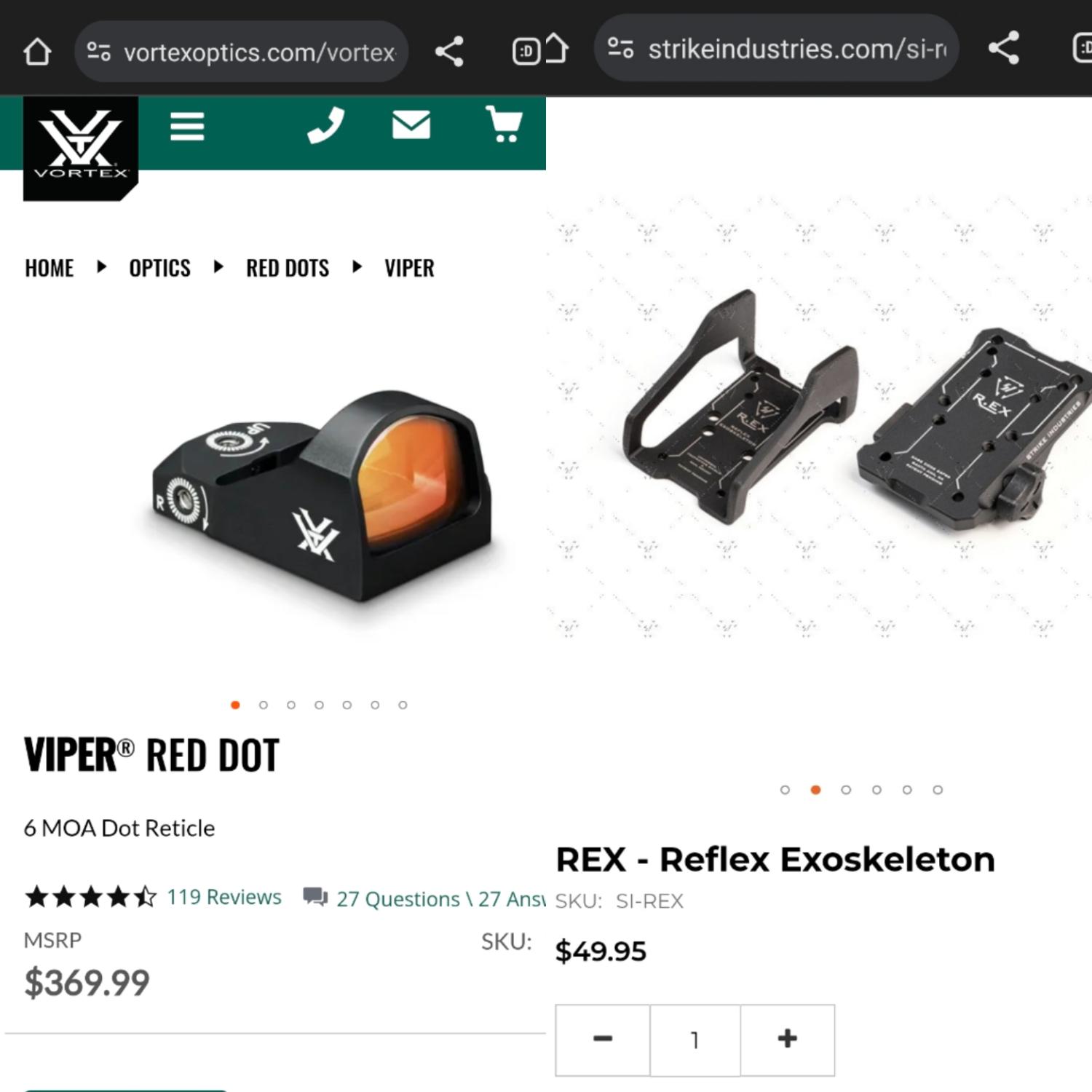 Vortex Viper 6MOA red dot with Strike Industries R.E.X (Reflex Exoskeleton) £220. R.E.X comes with the mounting hardware for all other types of red dot footprints too.