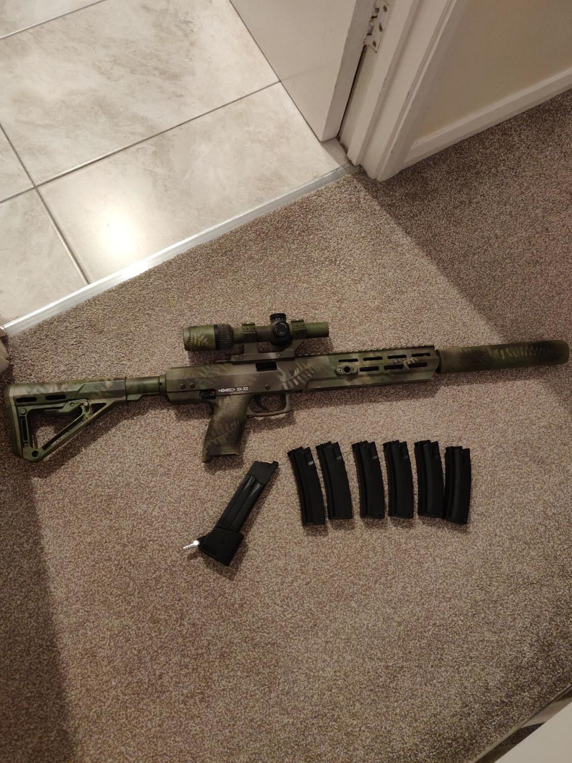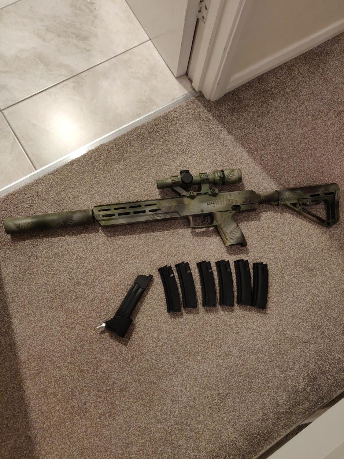 Has a maple leaf crazy jet barrel and 60 flamingo bucking, also has the tridos hop arm and adjustment wheel. Comes with everything in photos: suppressor, scope, airtac hpa mag adaptor with 6 small metal mp5 mags that hold 65 bbs. More pics or videos on request. £375
