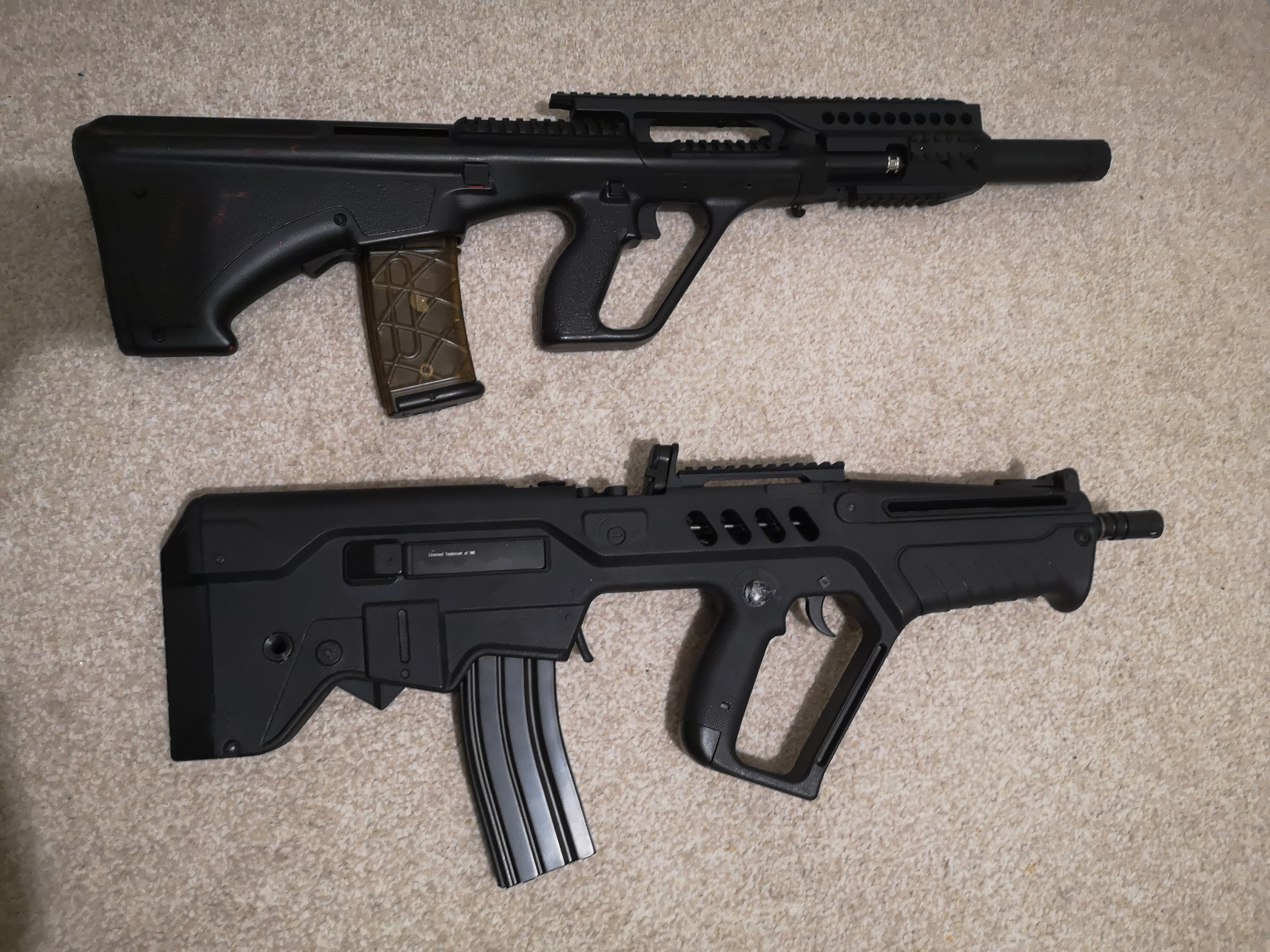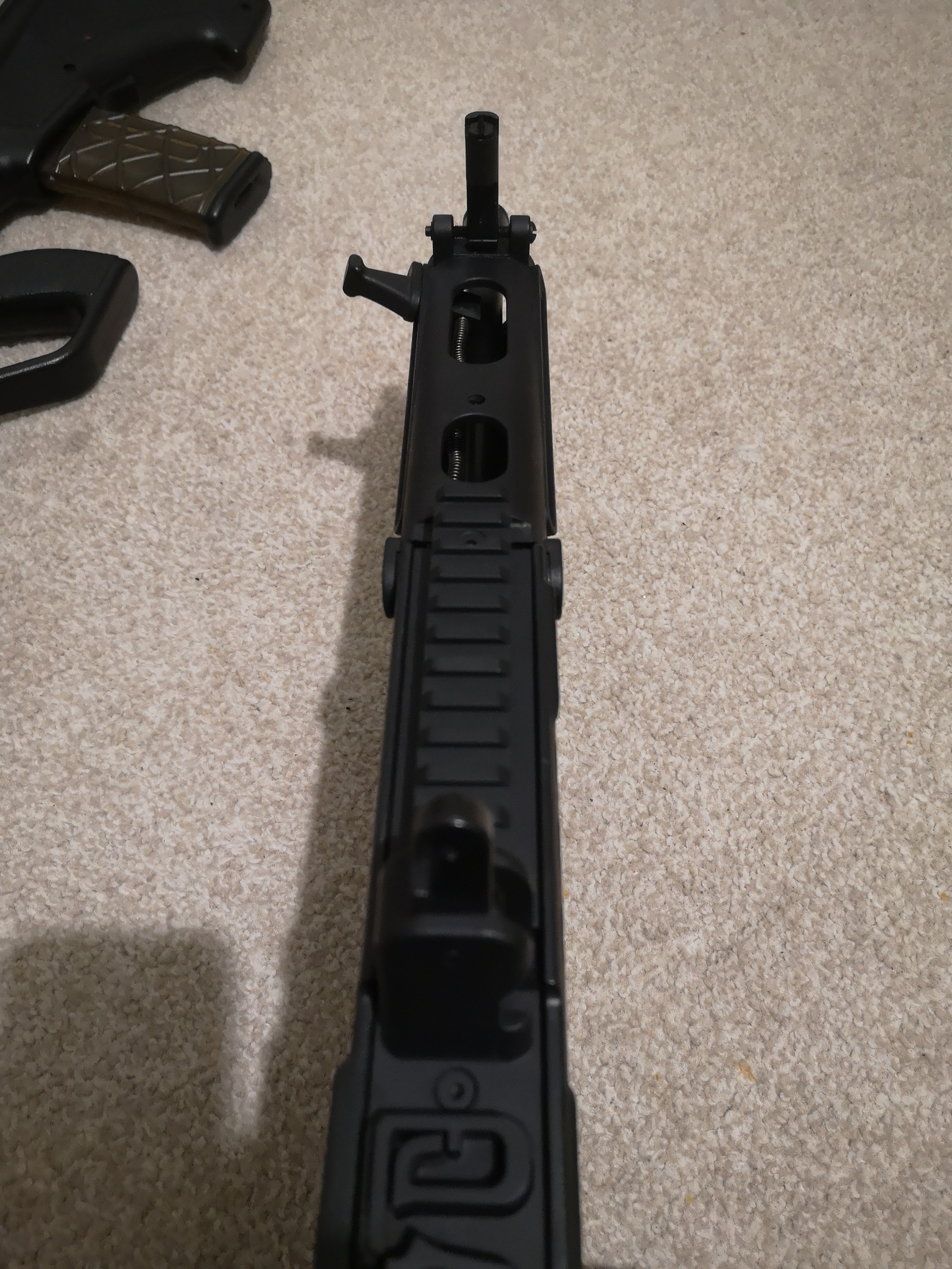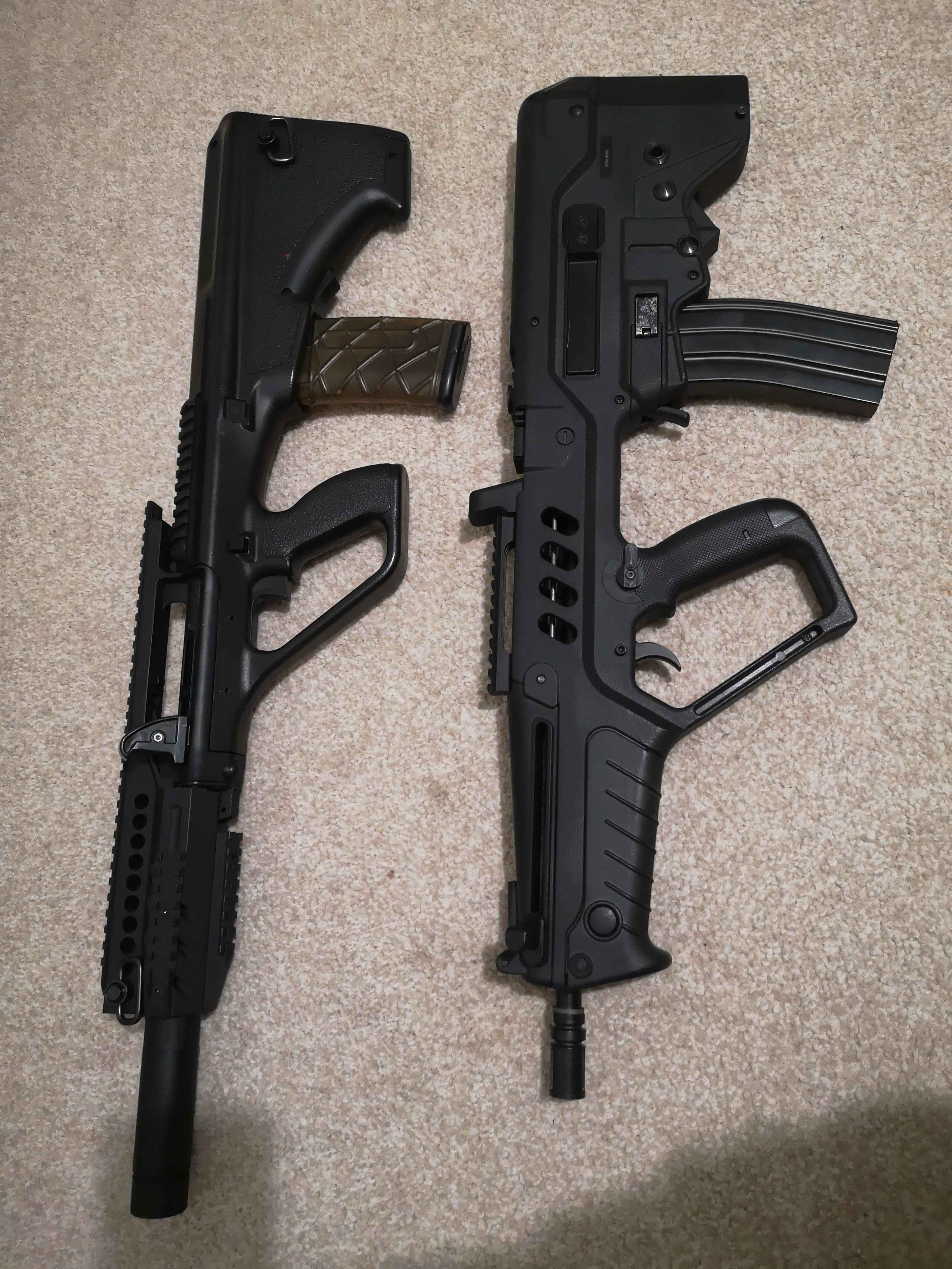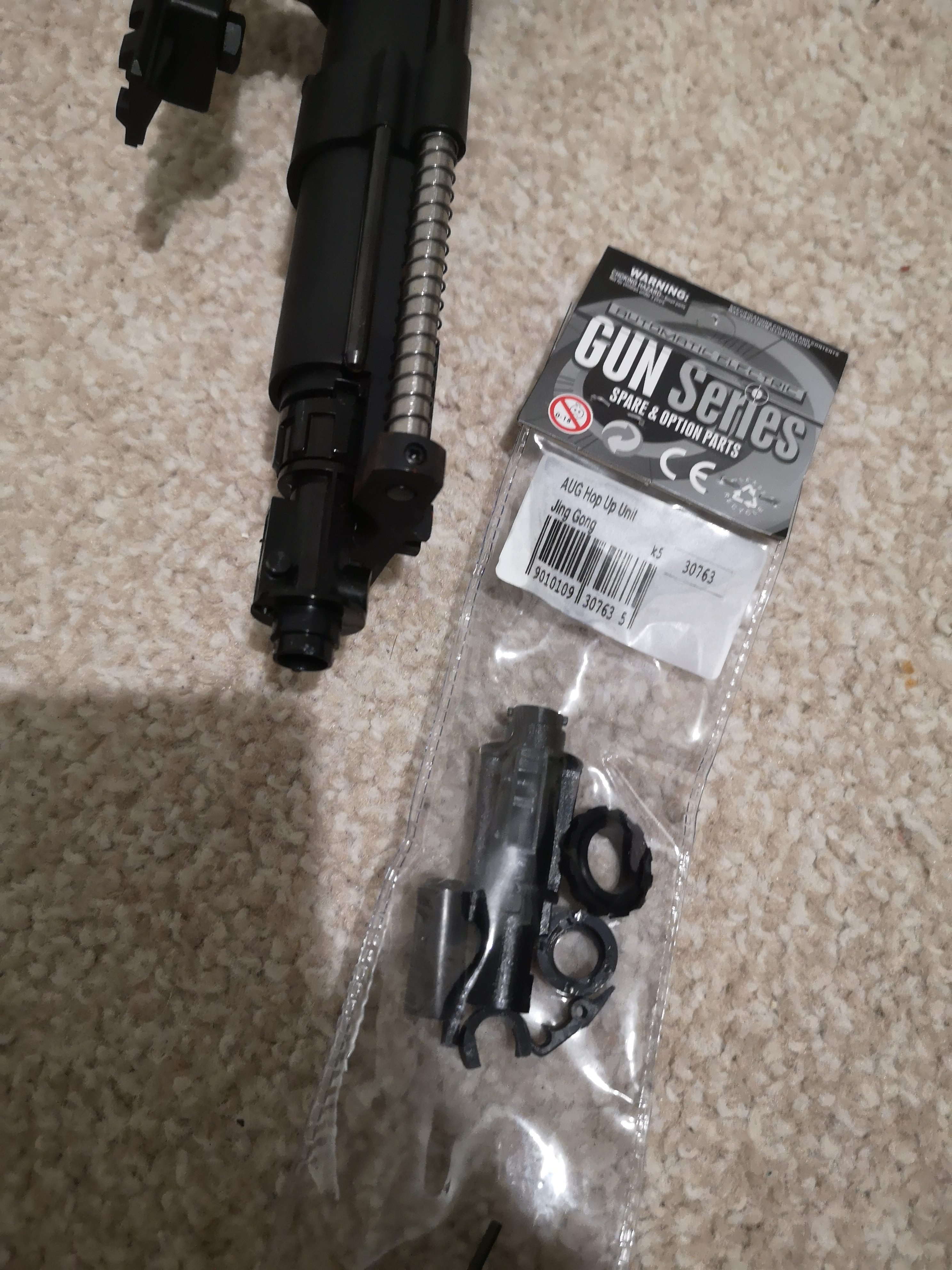 The Aug is, I think, a JG but I'm sure someone will correct me if I'm wrong. It cycles fine. The two tone paint is still present in places. The hop unit is missing the adjustment wheel so this comes with a new sealed jg Aug hop unit. The take down bolt (the bit you remove to split the upper from the lower) is a bit loose and I wouldn't trust it as it is. I bought the bolt as a new part but it could do with a bit of shimming so it's a snug fit. This comes with one hi cap. I've not attempted to shoot this given the hop unit situation but I'm happy to give it a go if needed.