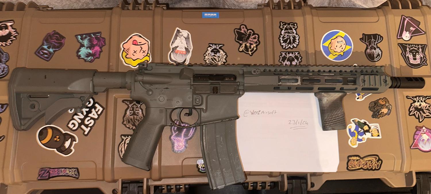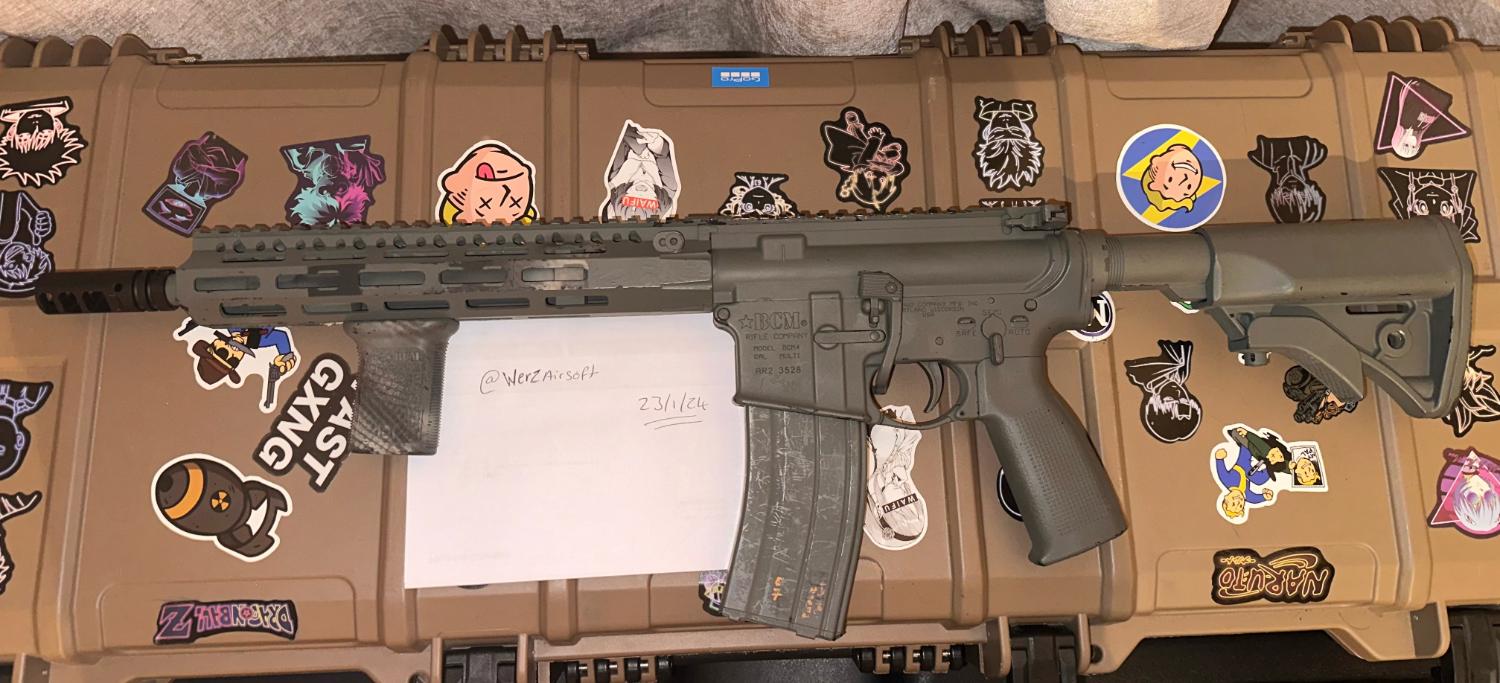 comes attached with a pts pistol grip, small sopmod style stock, Magpul BAD lever and real steel BCM grip.