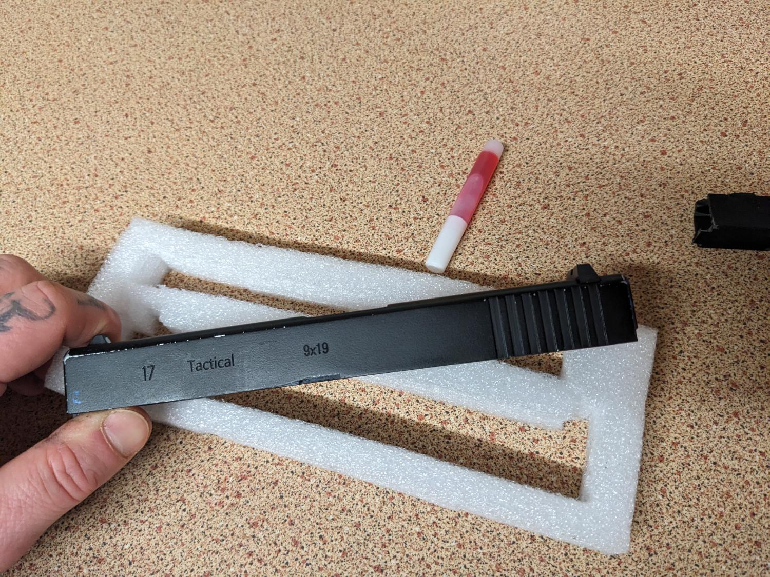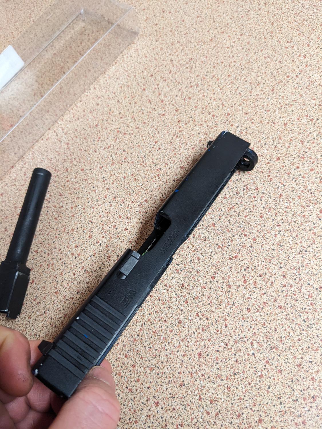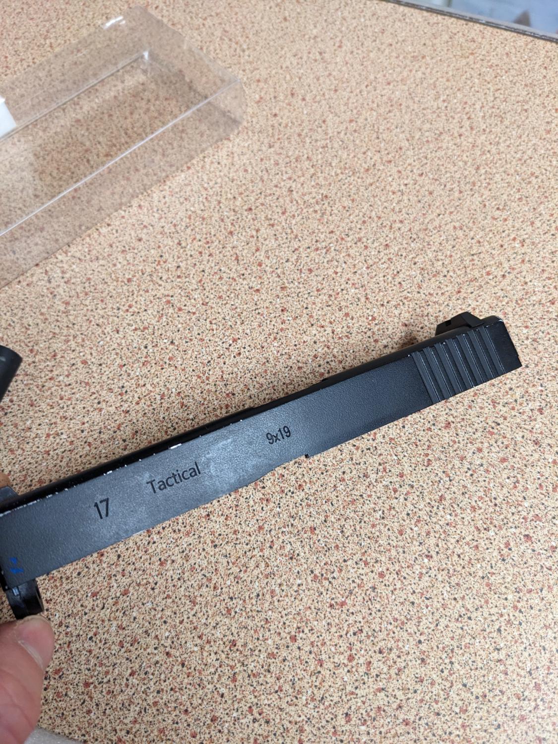 Slide is metal, but ex twat tone. It's been painted well but snowing a few flakes of blue.