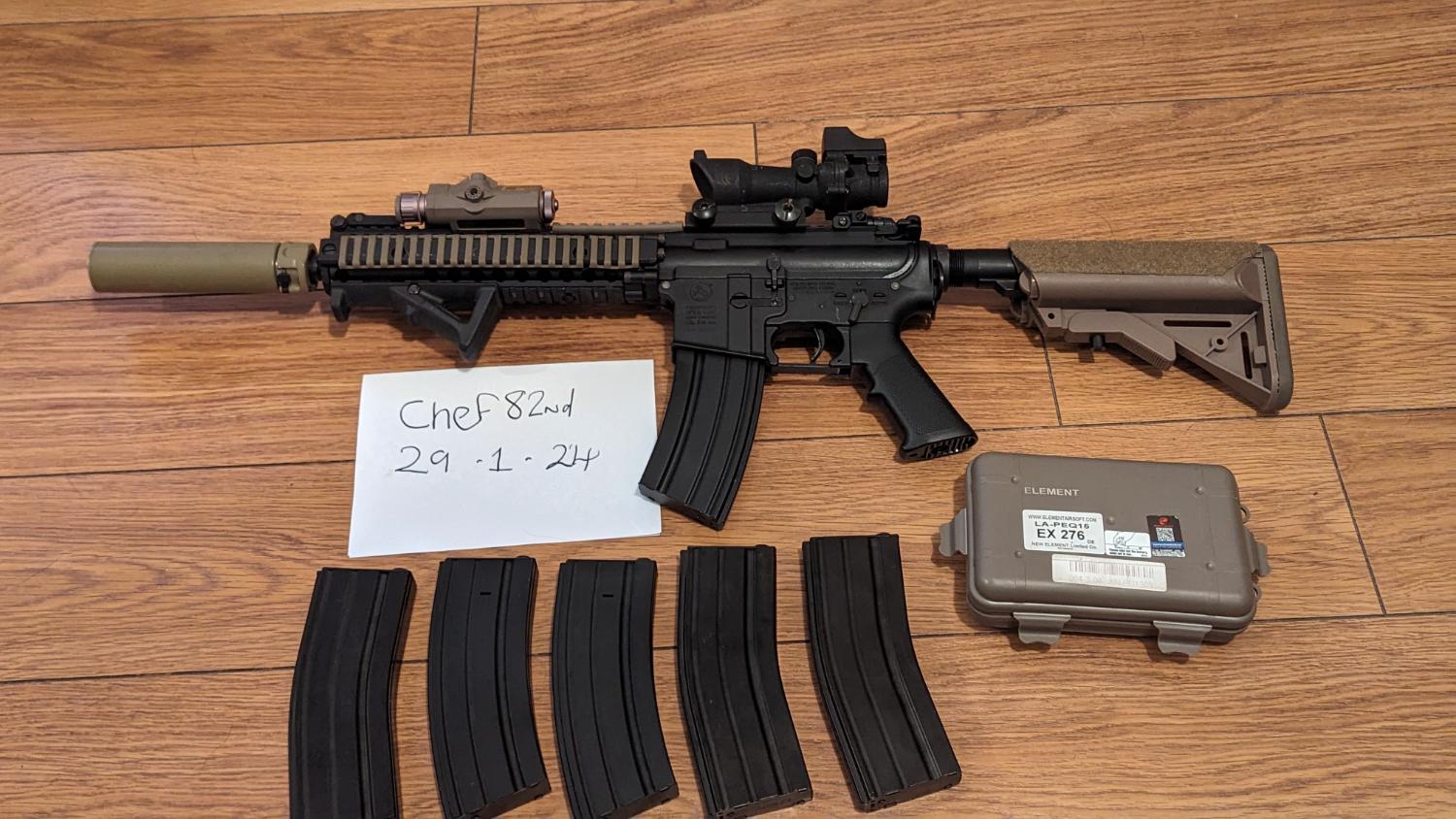 The base build gun was a W.E. M4 that was brand new In 2019. I sourced most of the parts over the following months and it was finally assembled and used for the first time late 2020 after that due to the lockdown it was boxed and put away . it hasn't been used since when it has been taken out to the few games i have done its been my back up and used for chrono checking and again never used .