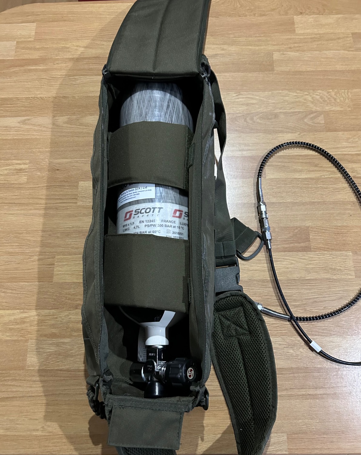 This is a Scott 4.7 litre HPA scuba tank. It comes with a Miltec cylinder bag and fill line.