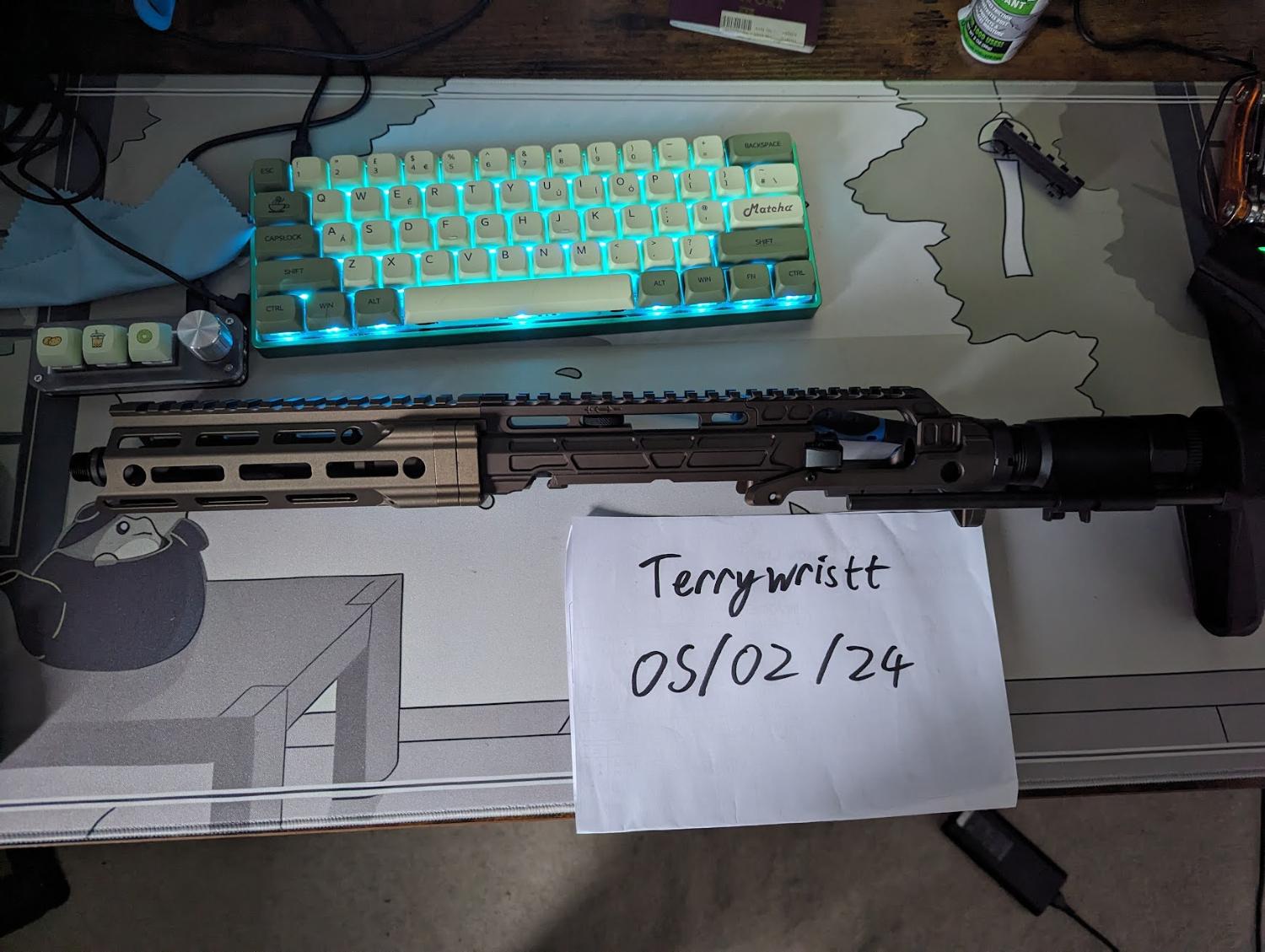 The additional externals include a MFR Mlok clone. a CYMA PDW Stock and a extended charging handle