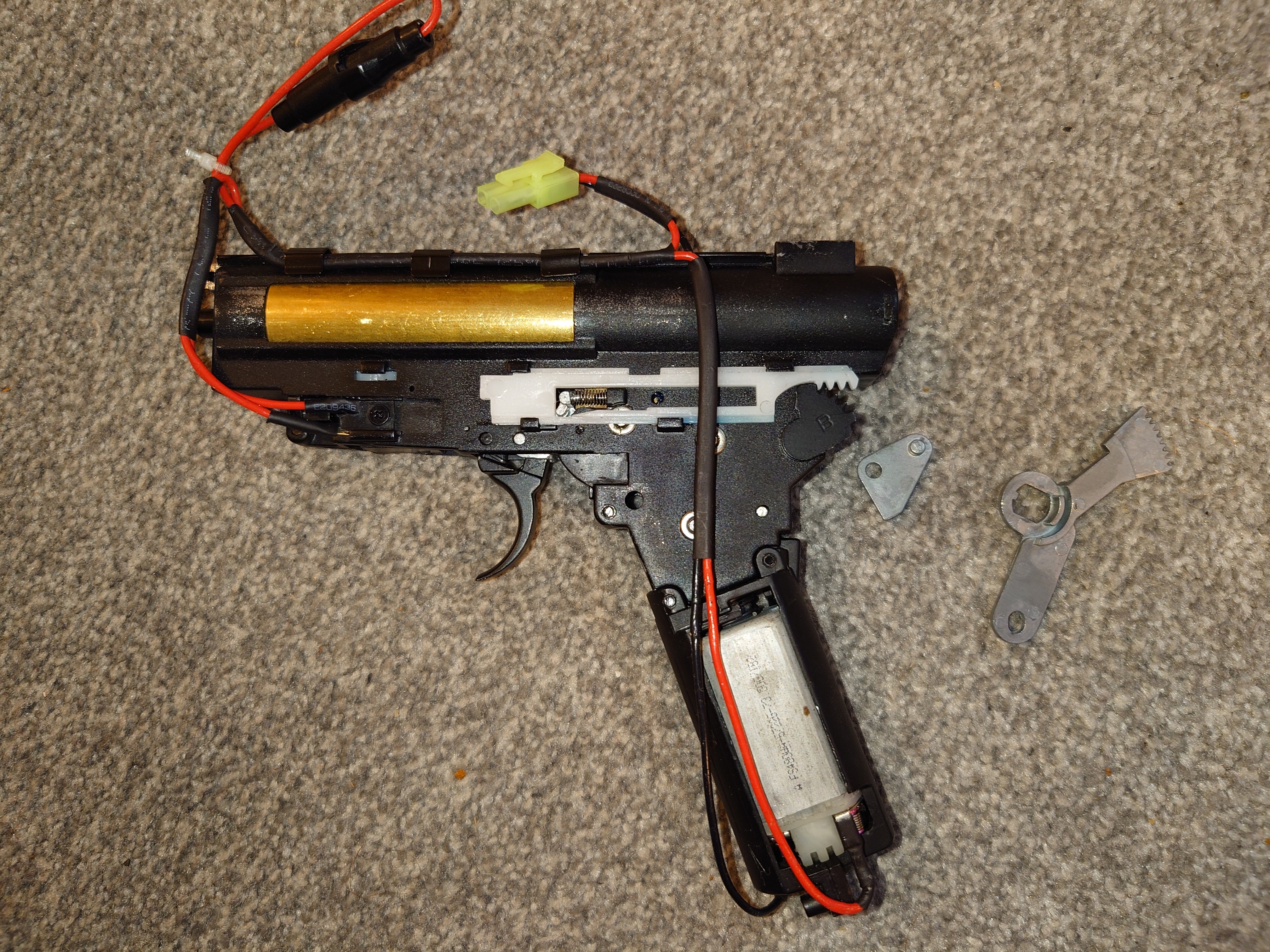 - Version 3 gearbox with motor, wiring loom and external selector gears. Fitted with a new Nuprol piston, vented piston head, and Guarder nozzle. Cycles when fired. Front screw mount filed down to fit Prowin hop £20