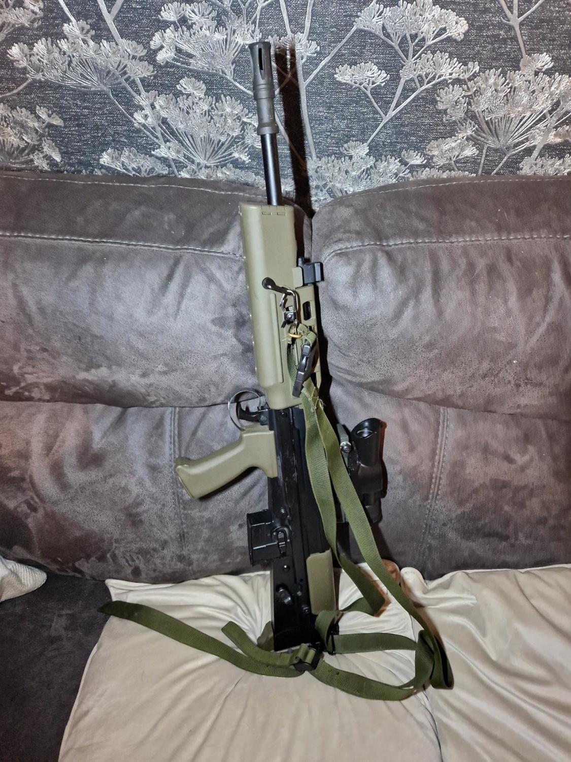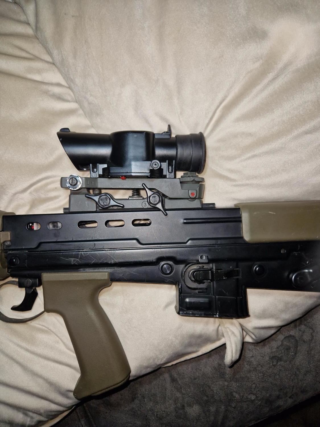 Ics l85a2 with ARES SUSAT, comes with sling and hicap magazine , also the original sights. It also comes with a new wiring loom as I nipped one of the wires changing the spring tension witch can be done by taking out the gear box. Has some scratches as seen from incorrect storage as this has only been used 3 times before nipping the wire. If you were a tech in any way you could solder it back together. It's wired to the front where the fake gas parts are I used a 7.4v lipo numchuck style battery. Can sell for £240 without the SUSAT.