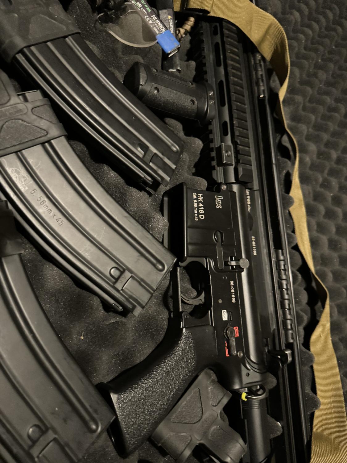7 magazines, red dot sight, ACOG sight, PEQ box, 2x foregrips, 2xbatteries