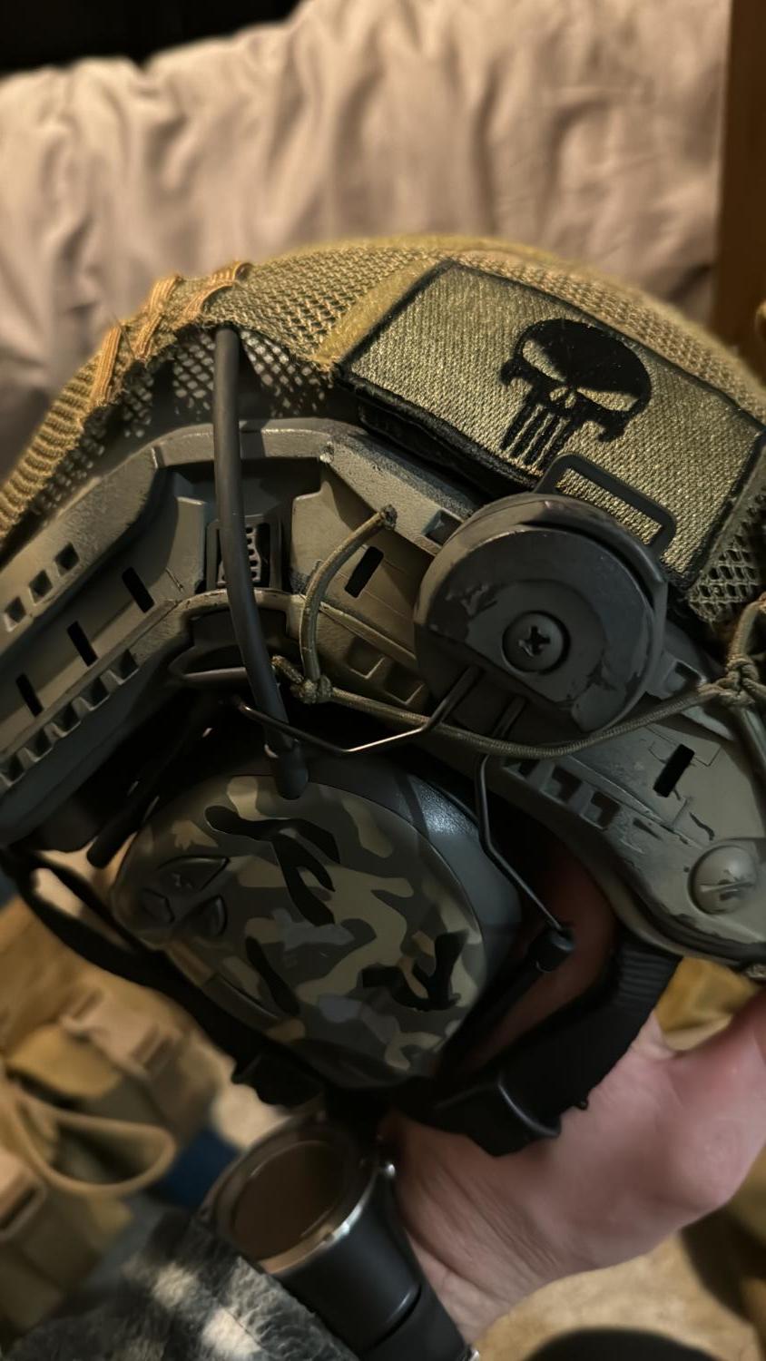 FAST Helmet, Helmet cover, Headset rail adaptors, custom mask clips (3 masks to interchange), Peltor Sporttac2 noise cancelling/amplifing headset (Honestly its like cheating as you can hear ever footstep) have the original headband and set of black headset covers if you dont want to run it like this.