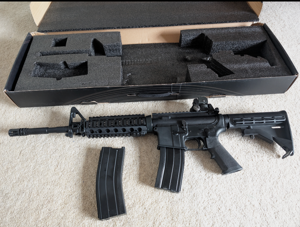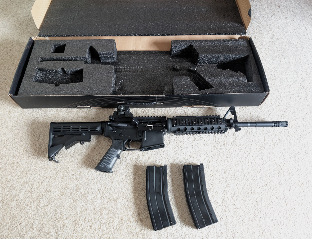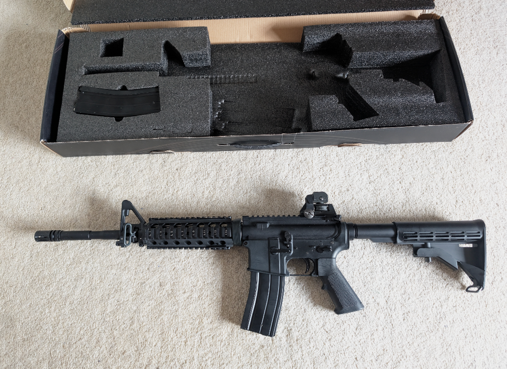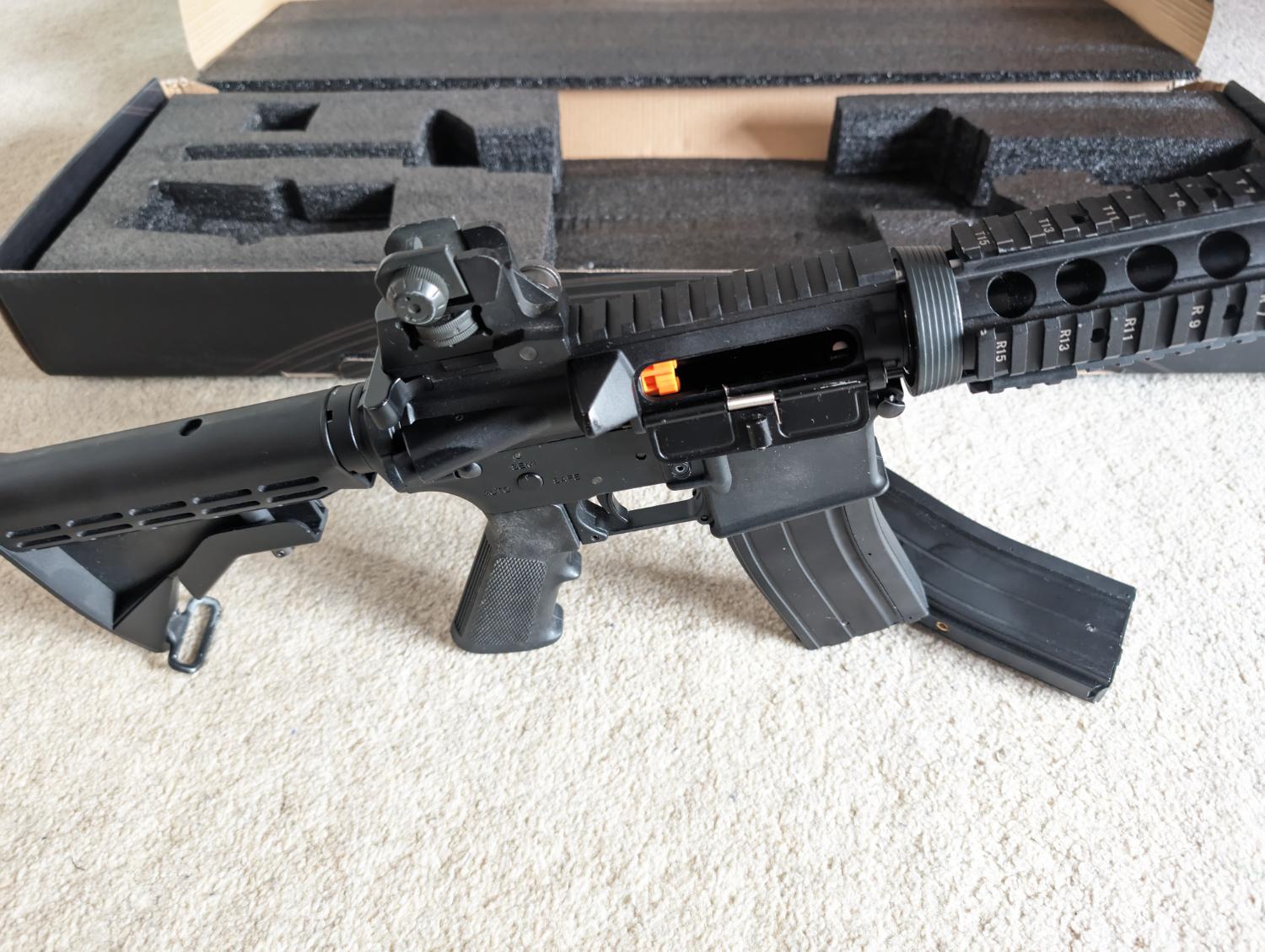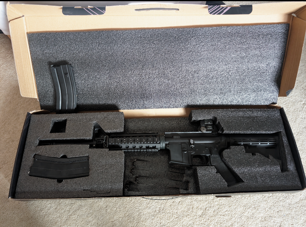 It's boxed fully stock, barely used polymer version with the metal picatinny handguard.