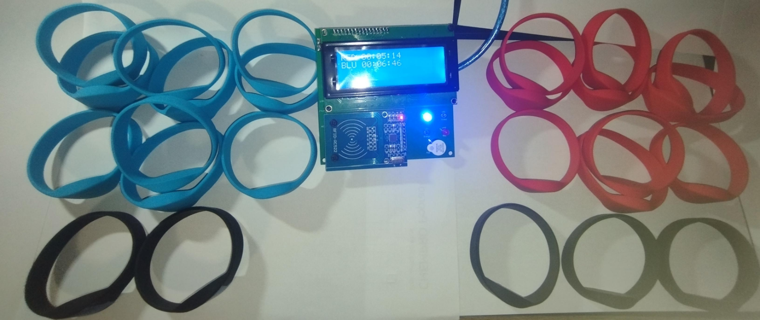 The hardware prototype has 2 LEDs in the colors of the given teams to indicate the current team holding the point. The player takes the team by attaching the RFID wristband to the reader. The wristbands are also in the colors of the teams, making it easier to distribute them to the players. The bracelets are maintenance-free.