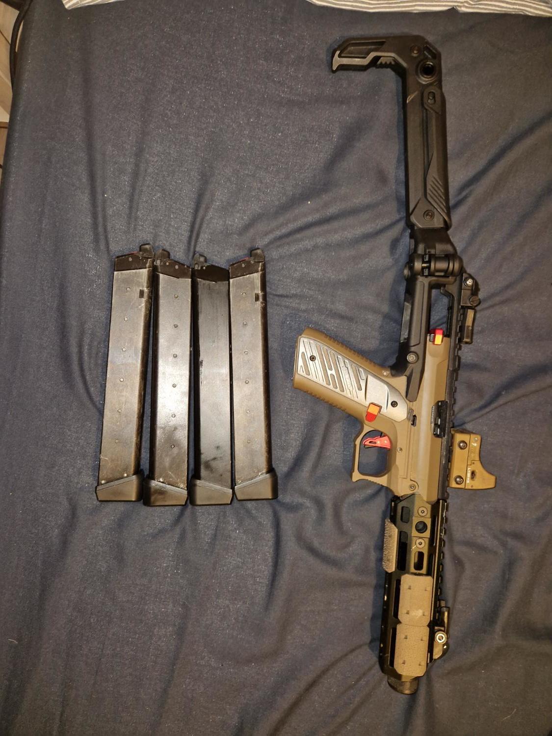 Comes with 3 gas tight mags, 1 leaky but its just a bad o-ring. 3 are Tokyo Marui, 1 is WE. Tokyo Marui rmr sight with picatinny adapter (slightly cracked but fixed with tolleys glue), and LITERALLY countless spare parts and random bits and pieces that I can't be bothered to sort through (an entire box full). CTM-Tac fuku furniture, CTM hammer set, CTM Ultralight bolt with charging handle, Loki TDC hop unit, SHS bucking, extended inner tightbore barrel, Action Army handguard and stock.