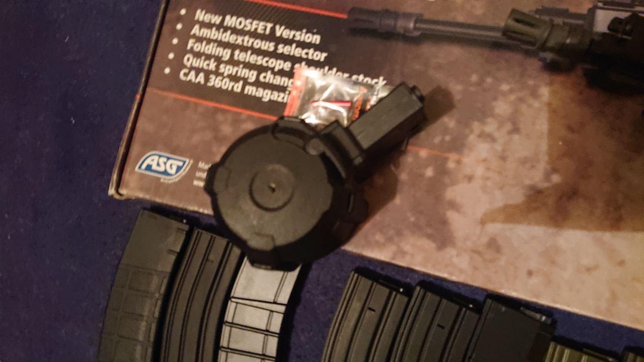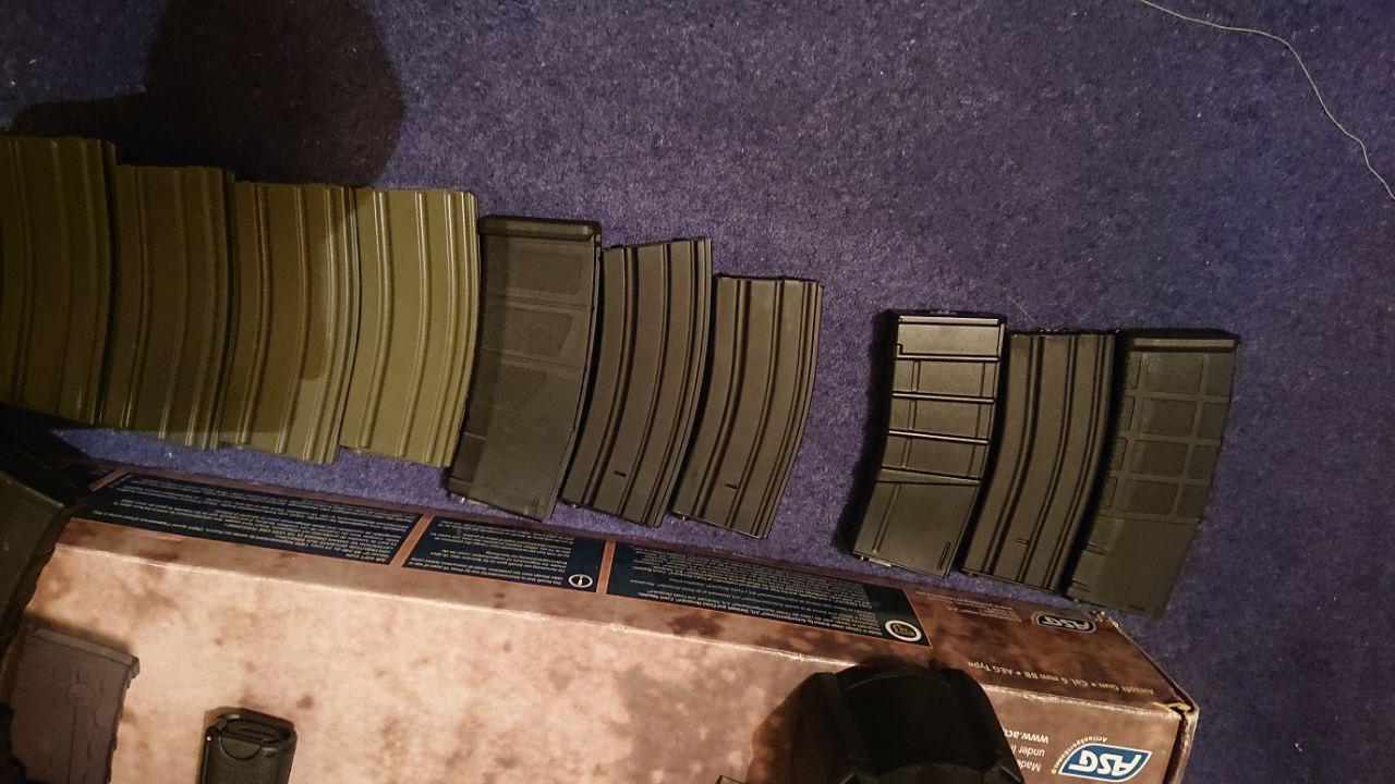 Bought this a while ago but never ended up skirmishing it. Its in beautiful condition and fires as it should. Included are a spare nozzle, 11.1 volt battery, A knockoff eotech that works well enough, and 1 caa high cap Looking for £185 posted with that lot or £170 without the eotech. From left to right on the mags there is 1 nuprol flash mag, 1 steel high cap 1 ics polymer high cap 2x unknown brand steel midcaps 1x unknown brand polymer midcap and 9x 75rd ares midcaps There is also one battleaxe d50 drum mag fully working, the battery and charger for it are also included. Ill do the lot for £205 or im open to offers on the mags individually.
